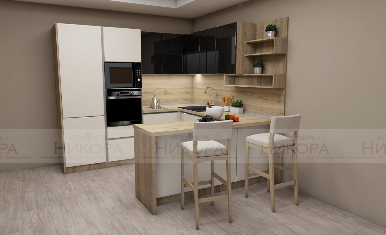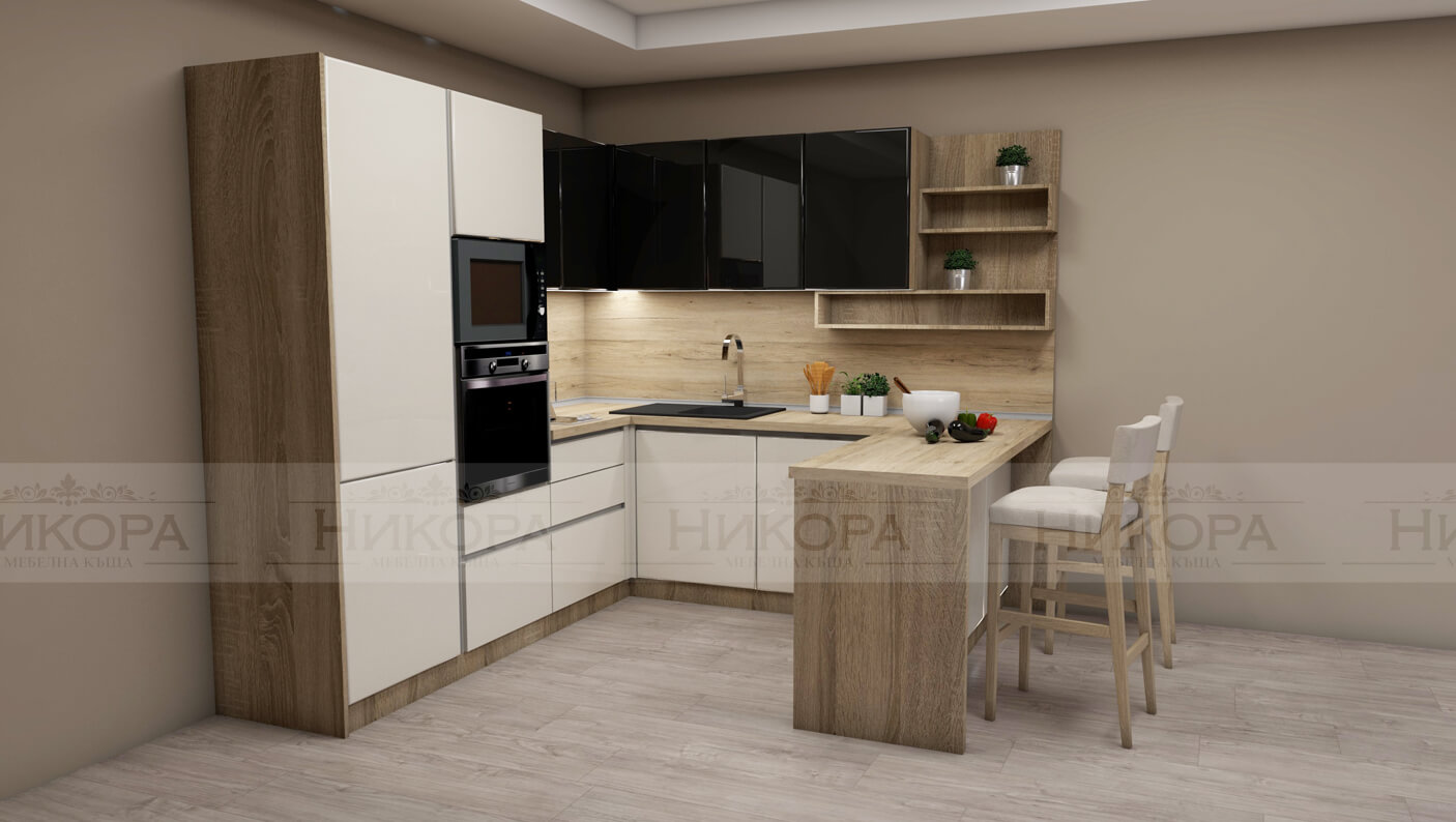 Това е проект за кухня изработена от проектантите на Мебелна къща „Никора“. Тя е с корпус от ПДЧ и лице от МДФ гланц. Кухните с лице от МДФ гланц са среден клас мебели – както като качество, така и ценово. Могат да бъдат поръчани с по-евтин или с по-скъп обков – панти, дръжки, механизми. Има възможност за избор на цветове за лице, корпус, а също и термоустойчив плот и термоустойчив гръб.