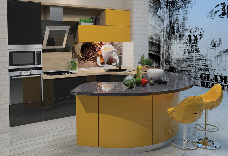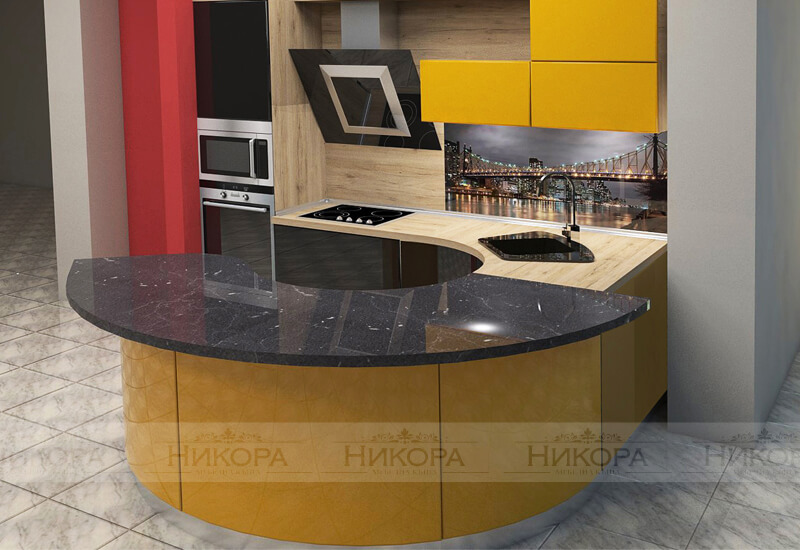 Това е проект за кухня изработена от проектантите на Мебелна къща “Никора”. Тя е с корпус от ПДЧ и лице от боядисан МДФ. Кухните с лице от боядисан МДФ са сравнително висок клас мебели – както като качество, така и ценово. При тези модели има възможност за изработване на модули с извити, огънати врати и детайли. Могат да бъдат поръчани с по-евтин или с по-скъп обков – панти, дръжки, механизми. Има възможност за избор на цветове за лице, корпус, а също и термоустойчив плот и термоустойчив гръб. Ние предлагаме и много актуалният вариант за гръб от принт стъкло в многобройни и ефектни картини.