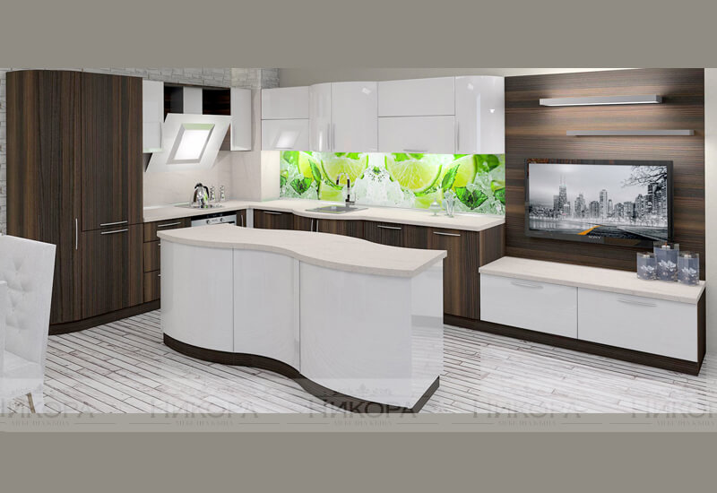Това е проект за кухня изработена от проектантите на Мебелна къща “Никора”. Тя е с корпус от ПДЧ и лице от боядисан МДФ. Кухните с лице от боядисан МДФ са сравнително висок клас мебели – както като качество, така и ценово. При тези модели има възможност за изработване на модули с извити, огънати врати и детайли. Могат да бъдат поръчани с по-евтин или с по-скъп обков – панти, дръжки, механизми. Има възможност за избор на цветове за лице, корпус, а също и термоустойчив плот и термоустойчив гръб. Ние предлагаме и много актуалният вариант за гръб от принт стъкло в многобройни и ефектни картини.