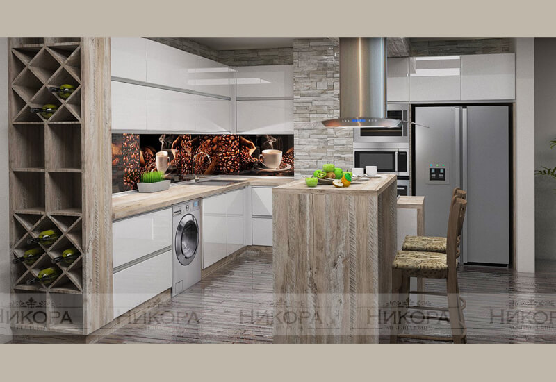 Това е проект за кухня изработена от проектантите на Мебелна къща “Никора”. Тя е с корпус от ПДЧ и лице от МДФ гланц. Кухните с лице от МДФ гланц са среден клас мебели – както като качество, така и ценово. Могат да бъдат поръчани с по-евтин или с по-скъп обков – панти, дръжки, механизми. Има възможност за избор на цветове за лице, корпус, а също и термоустойчив плот и термоустойчив гръб. Ние предлагаме и много актуалният вариант за гръб от принт стъкло в многобройни и ефектни картини.