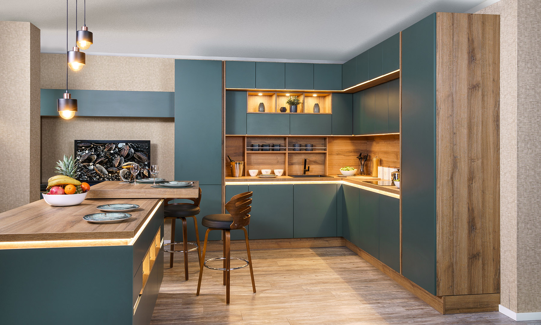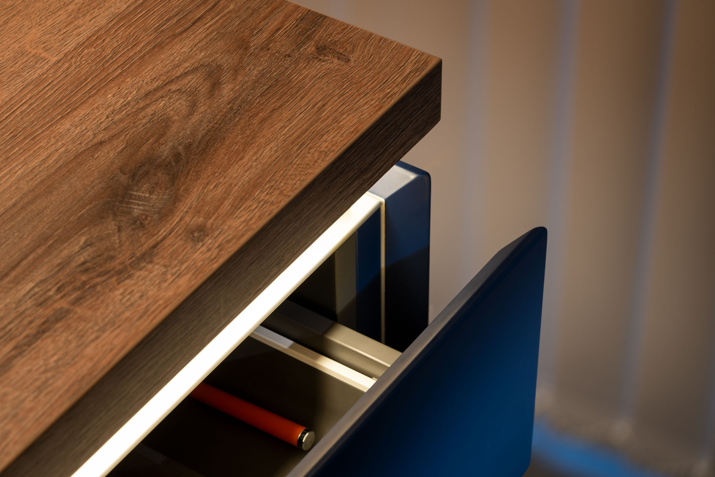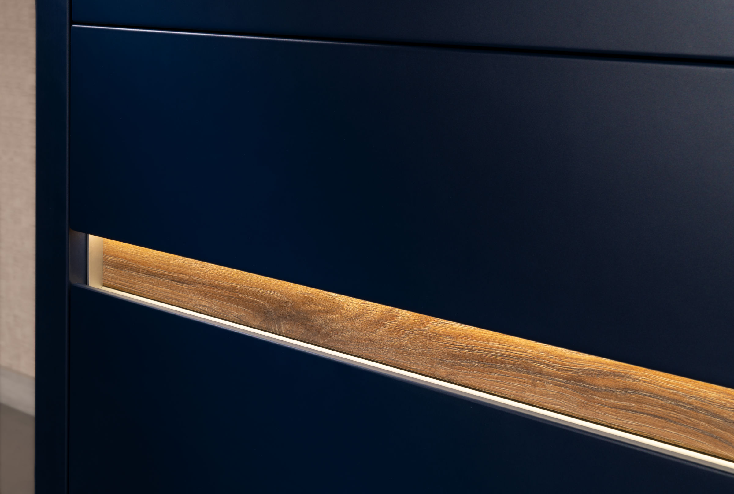 REGINA 2.0 e уникална със своите изчистени линии. Решихме отварянето на шкафовете без дръжки. Благодарение на скосяването под 45° от вътрешната страна на вратичките отварянето става удобно и лесно. А това може да стане както по цялата дължината така и по височина. Линията на дръжката дава възможност да се разкрие ефекта на прекрасния дървесния декор като важен елемент от цялостната визия.