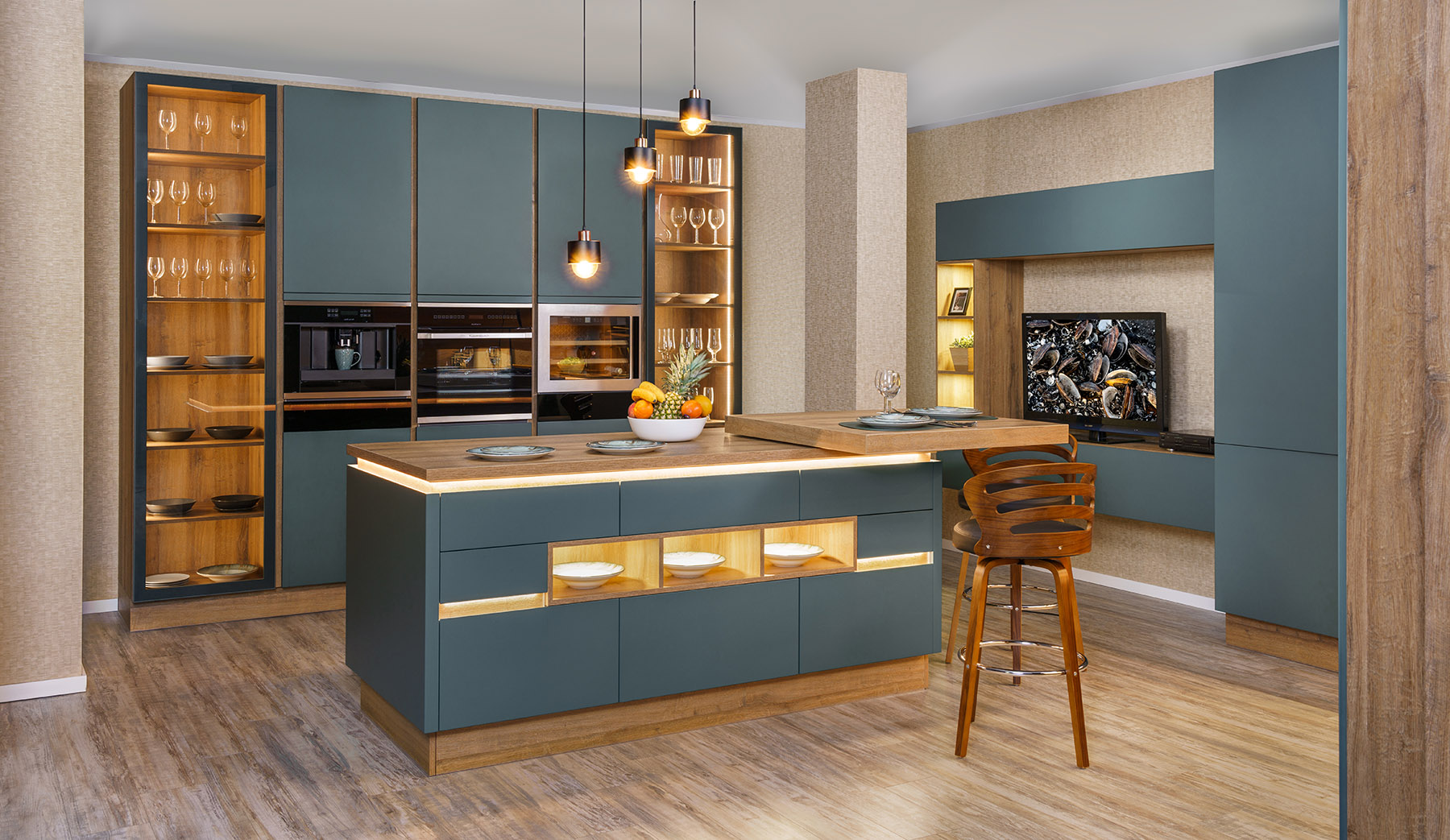 Стъклените витрини се отличават с деликатно тонирано стъкло. Алуминиевата рамка е боядисана в цвета на фронтове. Витрините греят с меко осветление по цялата си височина. Силата на светлината може да бъде контролирана спрямо вашите предпочитания.