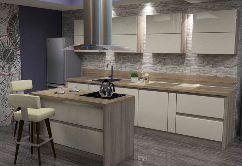 Това е проект за кухня изработена от проектантите на Мебелна къща “Никора”. Тя е с корпус от ПДЧ и лице от боядисан МДФ.