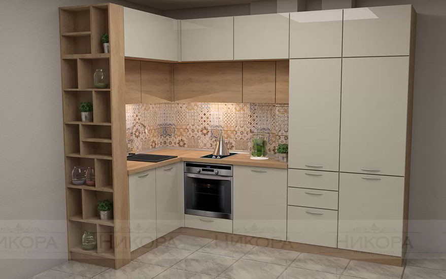 Това е проект за кухня изработена от проектантите на Мебелна къща „Никора“. Тя е с корпус от ПДЧ и лице от МДФ гланц. Кухните с лице от МДФ гланц са среден клас мебели – както като качество, така и ценово. Могат да бъдат поръчани с по-евтин или с по-скъп обков – панти, дръжки, механизми. Има възможност за избор на цветове за лице, корпус, а също и термоустойчив плот и термоустойчив гръб.