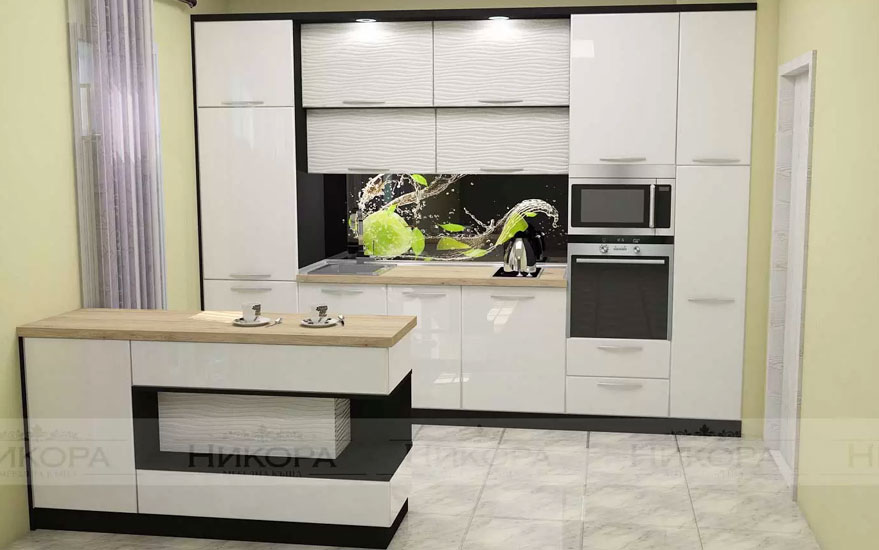 Това е проект за кухня изработена от проектантите на Мебелна къща „Никора“. Тя е с корпус от ПДЧ и лице от МДФ гланц. Кухните с лице от МДФ гланц са среден клас мебели – както като качество, така и ценово. Могат да бъдат поръчани с по-евтин или с по-скъп обков – панти, дръжки, механизми. Има възможност за избор на цветове за лице, корпус, а също и термоустойчив плот и термоустойчив гръб.