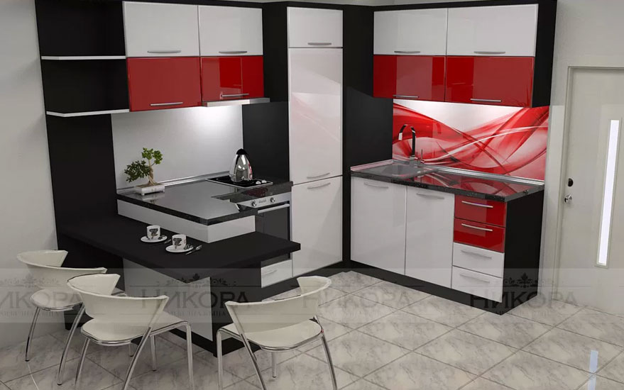 Това е проект за кухня изработена от проектантите на Мебелна къща „Никора“. Тя е с корпус от ПДЧ и лице от МДФ гланц. Кухните с лице от МДФ гланц са среден клас мебели – както като качество, така и ценово. Могат да бъдат поръчани с по-евтин или с по-скъп обков – панти, дръжки, механизми. Има възможност за избор на цветове за лице, корпус, а също и термоустойчив плот и термоустойчив гръб.