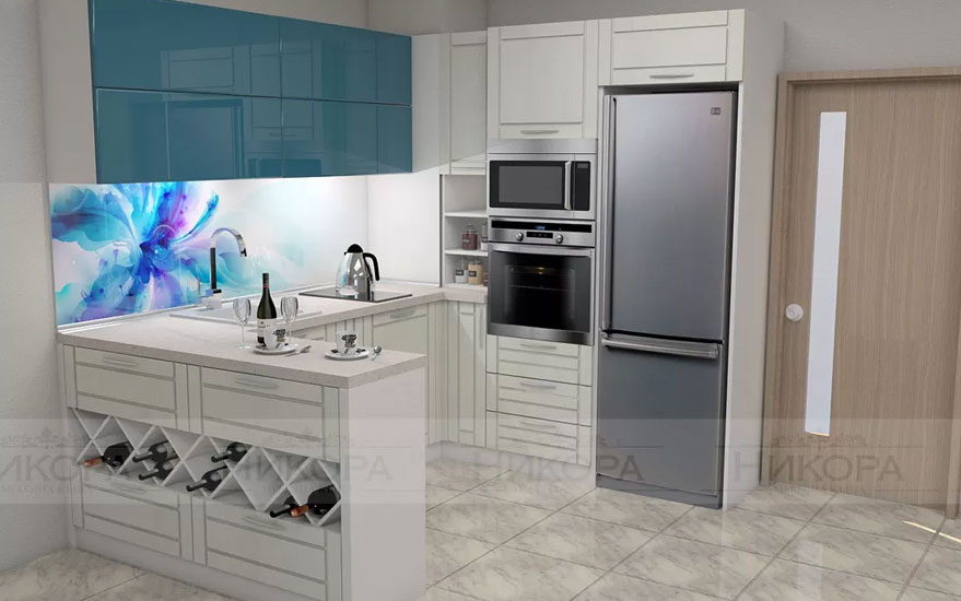 Това е проект за кухня изработена от проектантите на Мебелна къща „Никора“. Тя е с корпус от ПДЧ и лице от МДФ гланц. Кухните с лице от МДФ гланц са среден клас мебели – както като качество, така и ценово. Могат да бъдат поръчани с по-евтин или с по-скъп обков – панти, дръжки, механизми. Има възможност за избор на цветове за лице, корпус, а също и термоустойчив плот и термоустойчив гръб.