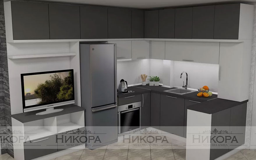 Това е проект за кухня изработена от проектантите на Мебелна къща „Никора“. Тя е с корпус от ПДЧ и лице от МДФ гланц. Кухните с лице от МДФ гланц са среден клас мебели – както като качество, така и ценово. Могат да бъдат поръчани с по-евтин или с по-скъп обков – панти, дръжки, механизми. Има възможност за избор на цветове за лице, корпус, а също и термоустойчив плот и термоустойчив гръб.