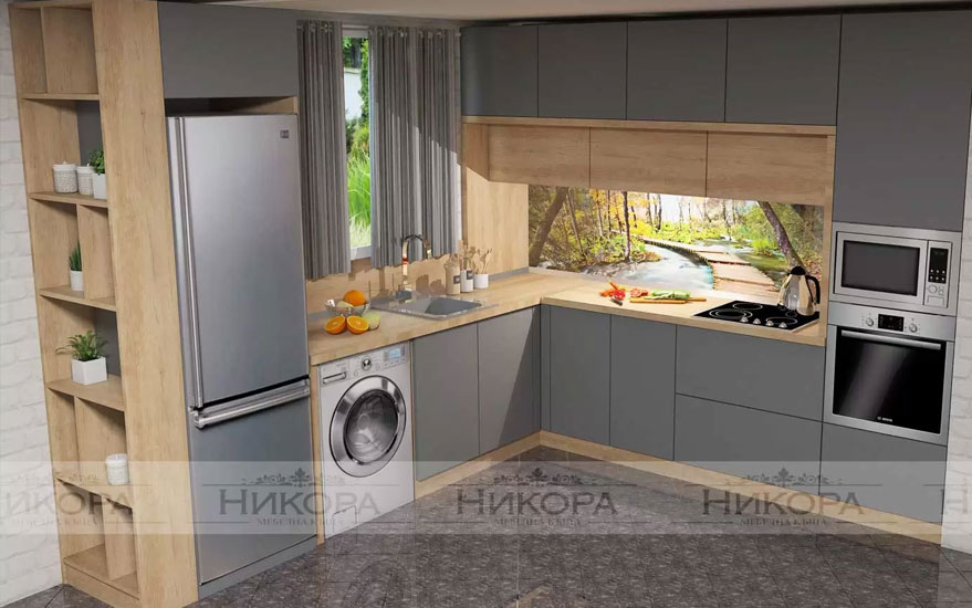 Това е проект за кухня изработена от проектантите на Мебелна къща „Никора“. Тя е с корпус от ПДЧ и лице от МДФ гланц. Кухните с лице от МДФ гланц са среден клас мебели – както като качество, така и ценово. Могат да бъдат поръчани с по-евтин или с по-скъп обков – панти, дръжки, механизми. Има възможност за избор на цветове за лице, корпус, а също и термоустойчив плот и термоустойчив гръб.
