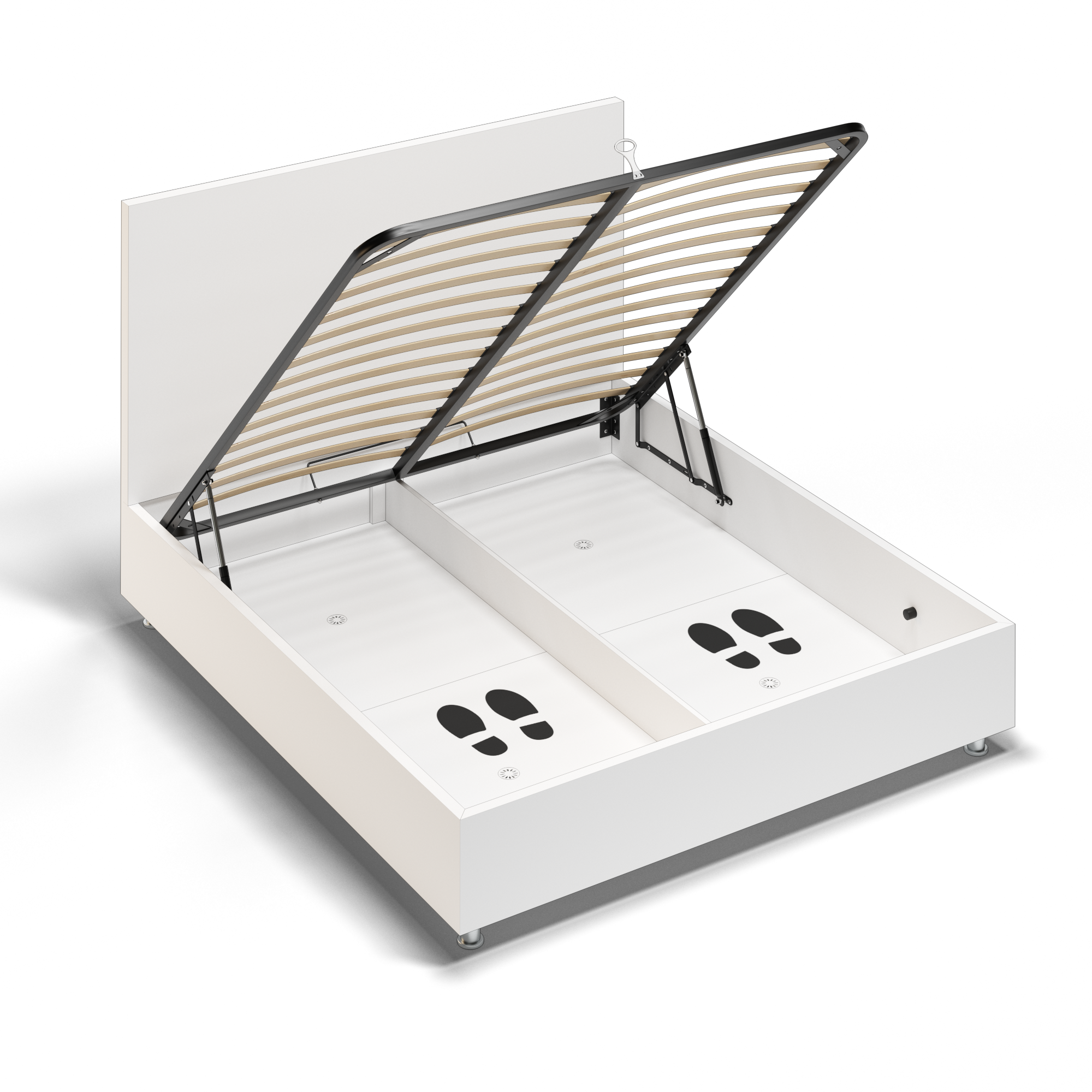 Леглото е в комплект с подматрачна рамка, повдигащ механизъм и разполага с ракла за съхранение на багаж, като вътрешната част може да бъде бяла или антрацит.