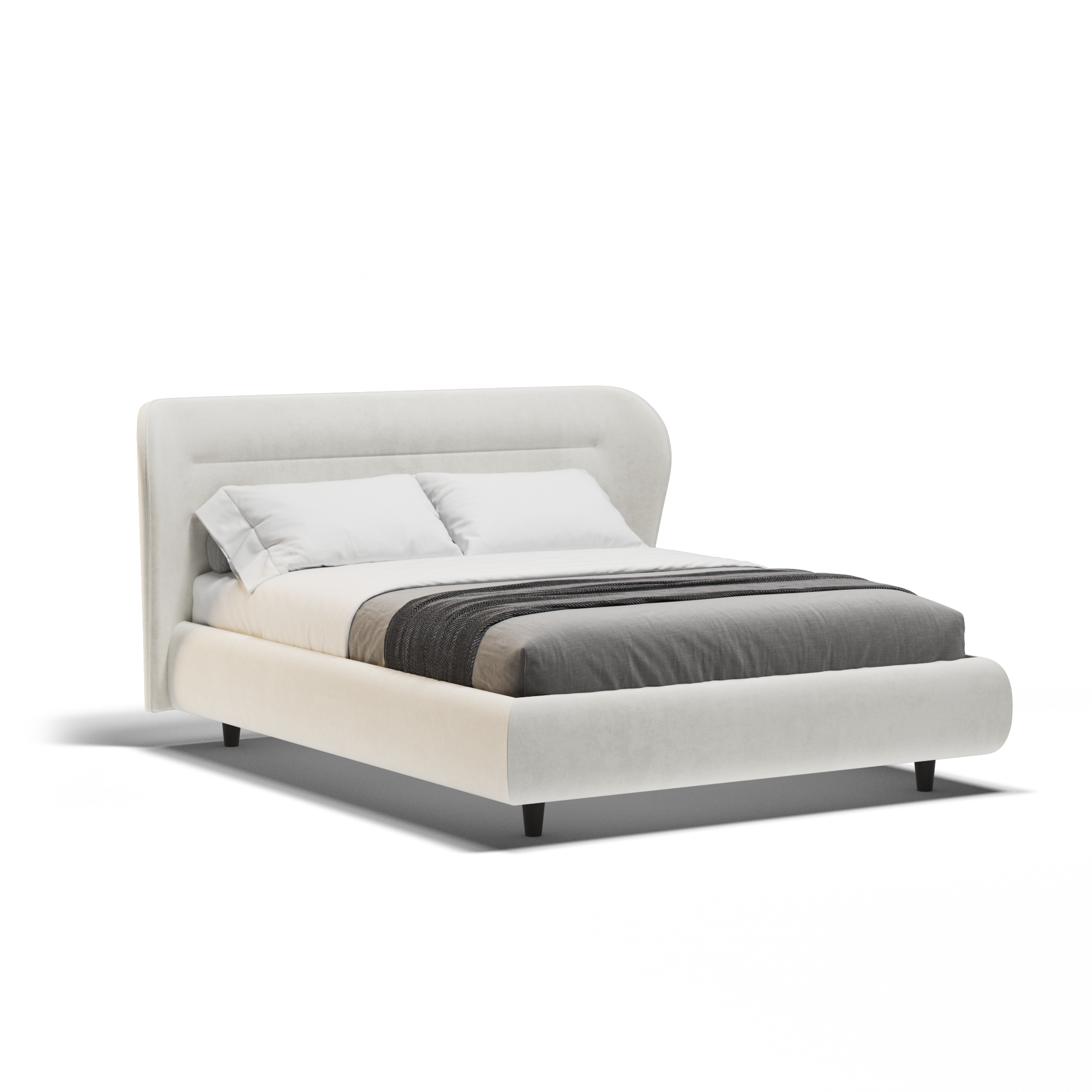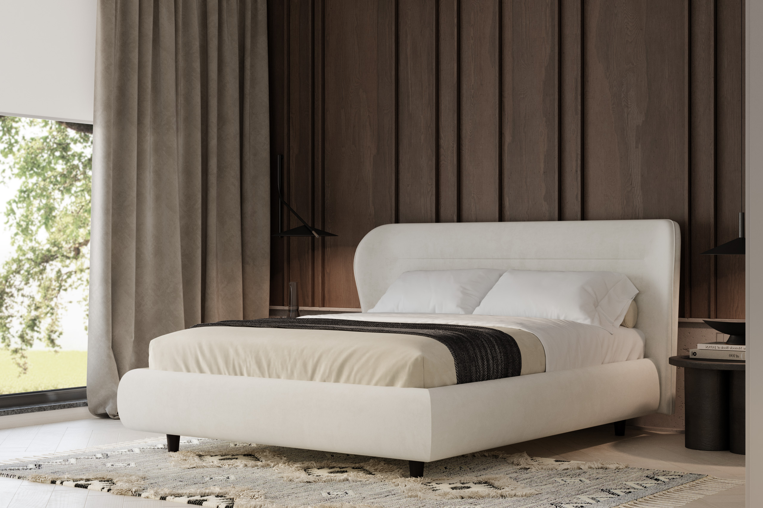 Леглото е облечено в кадифена тапицерия в светъл и спокоен нюанс, който отразява естествената светлина и подчертава плавната форма на модела. Текстурата е приятна на допир и създава усещане за моментален комфорт. Моделът се предлага и в други фини тонове, като може да бъде персонализиран според интериора.