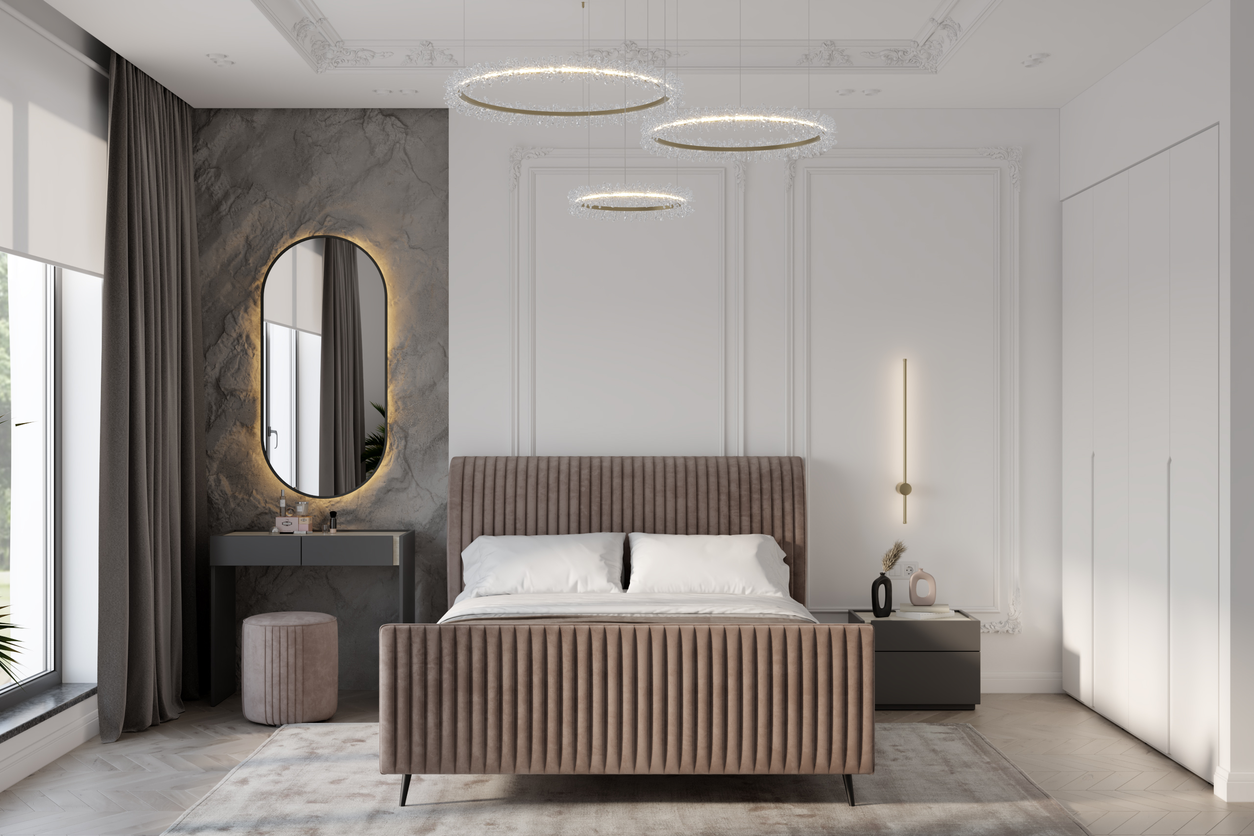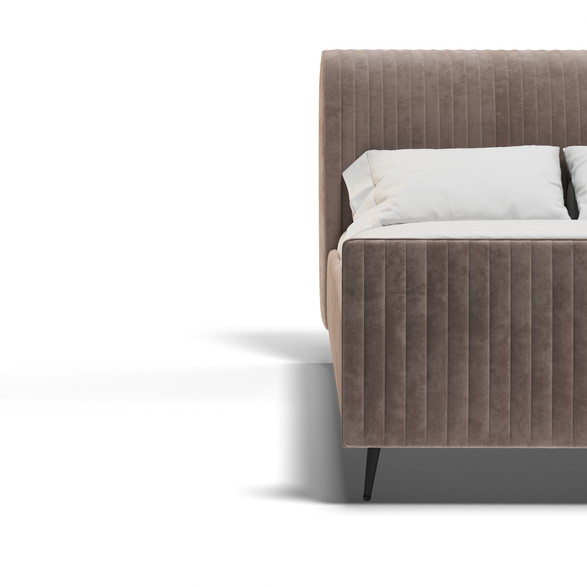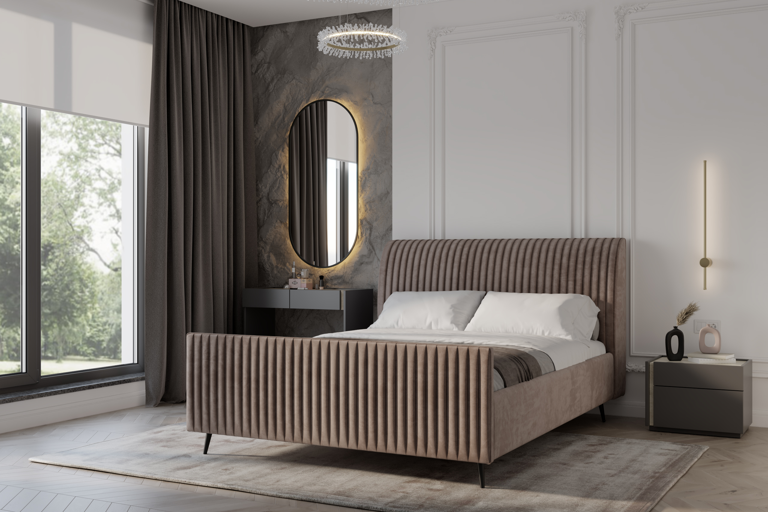 Ясната структура с добре дефинирани вертикални линии и щедри пропорции оформя легло, което налага стил чрез своята простота и подреденост. Високата, леко извита табла създава усещане за обгръщане и стабилност, докато здравата рамка и прецизните финиши добавят нотка на естетическа авторитетност. Monroe е идеален за съвременни, мъжки интериори или за класически спални, преразгледани с модерни акценти.