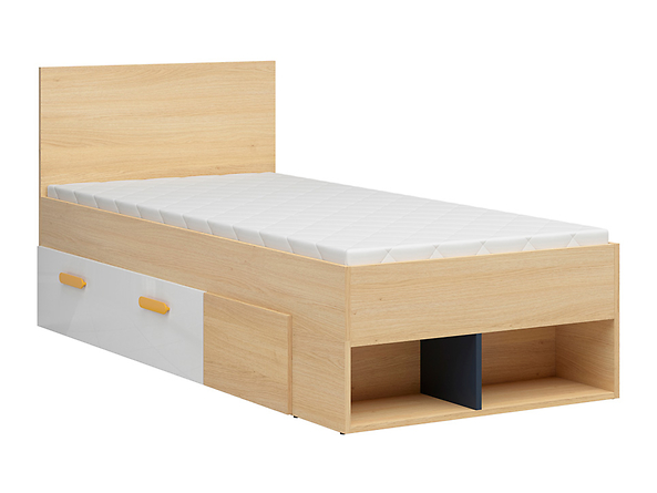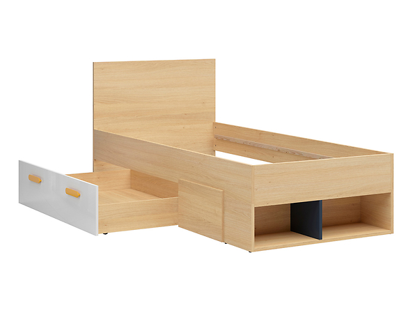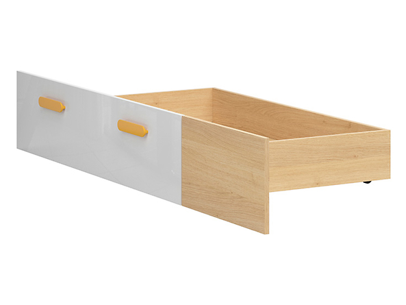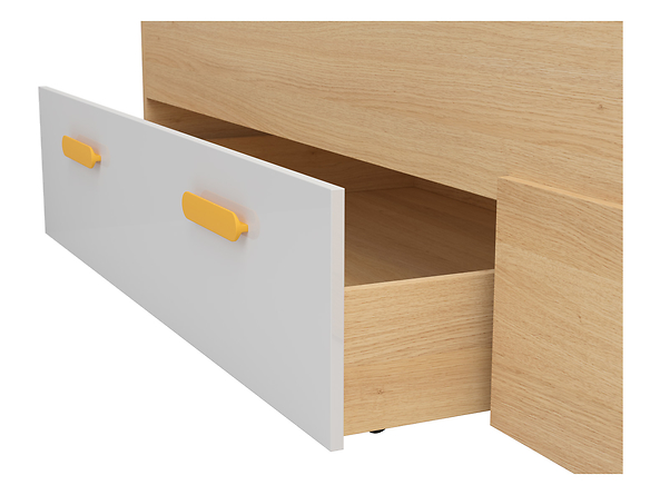 Предимството на мебелите от модулната система Wesker са нейните цветове. Огледално бели и жълти фронтове са комбинирани с корпус от полски дъб и тъмносини рафтове. За контраст са избрани овалните, тъмносини и жълти дръжки, които подчертават свободния, младежки стил. Комфортното използване на мебелите се дължи на водачите и пантите с безшумна система за затваряне.