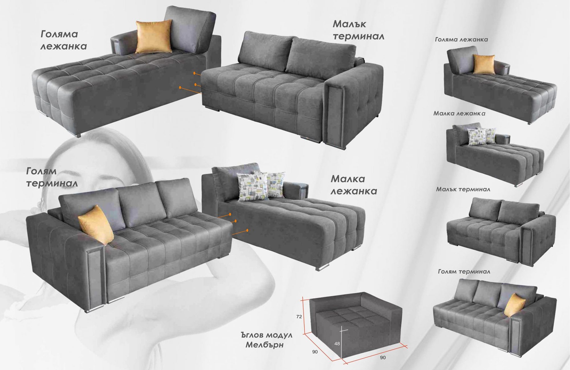 Модулен диван МЕЛБЪРН излъчва класа, елегантност и комфорт. Вписва се във всяко съвременно жилище и задоволява изискванията по отношение на качеството и надежността, които предлага.