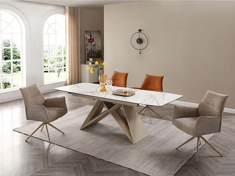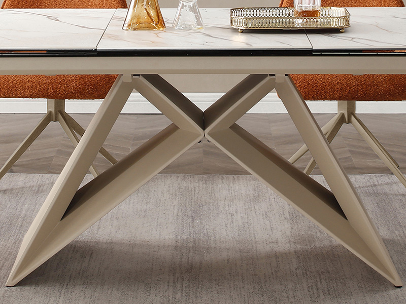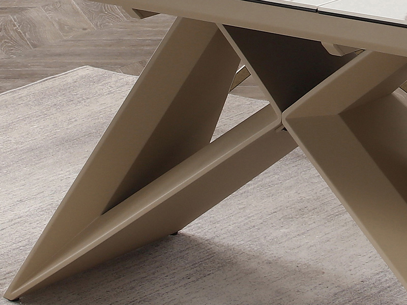 Модерна разтегателна трапезна маса с метална основа и плот, състоящ се от 6 мм закалено стъкло, покрито с 6 мм керамичен слой. Керамиката е изключително устойчива на надраскване, влага и високи температури, което я прави практичен и дълготраен материал.