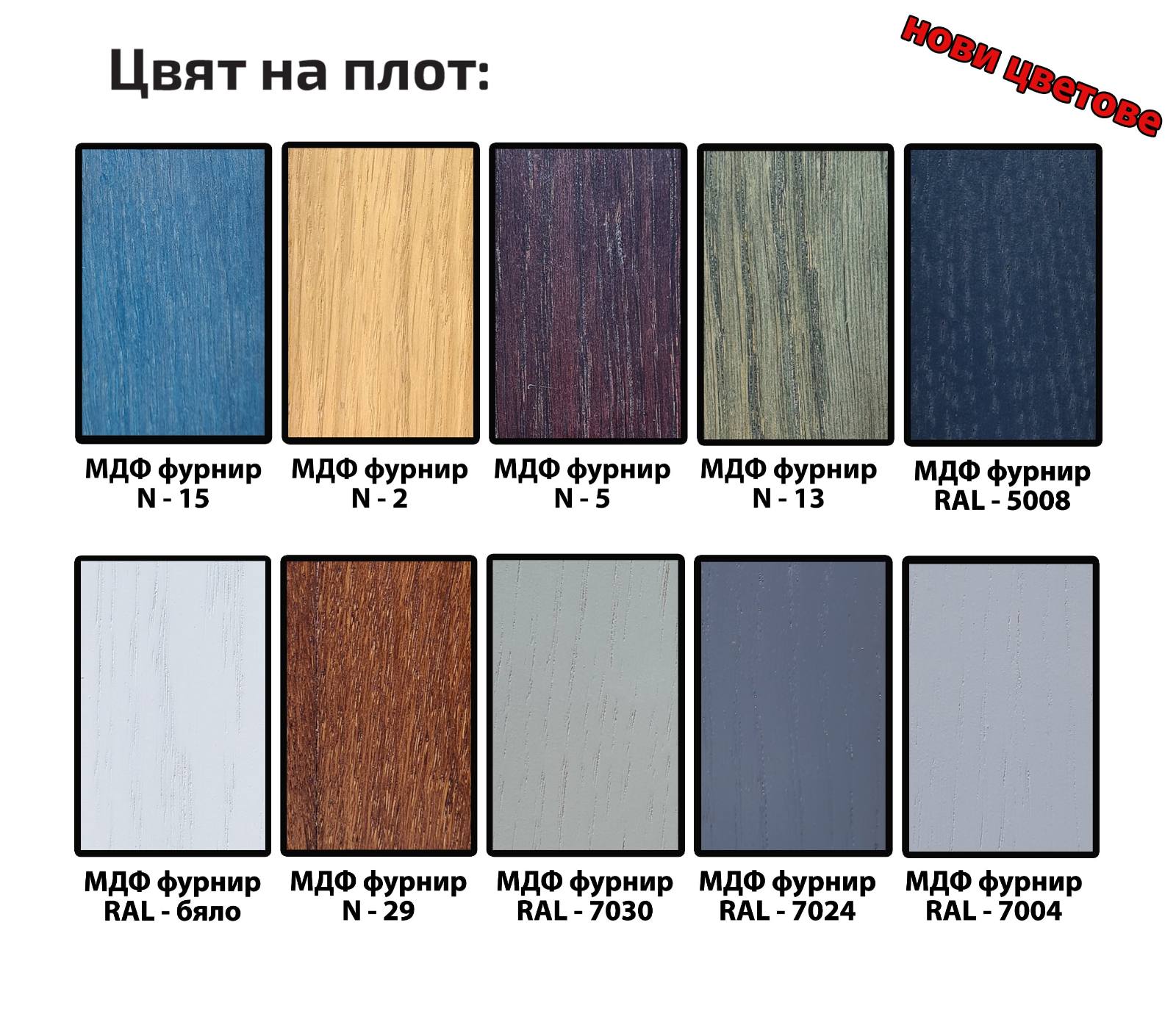 Цветът на плот МДФ може да бъде: бяло мат – 8586, черно мат- 190, базалт-166 (тъмно-сиво) , аметист грей – EVS 003 (тъмен кашмир) и дъск блу K 097 (сиво-синьо)