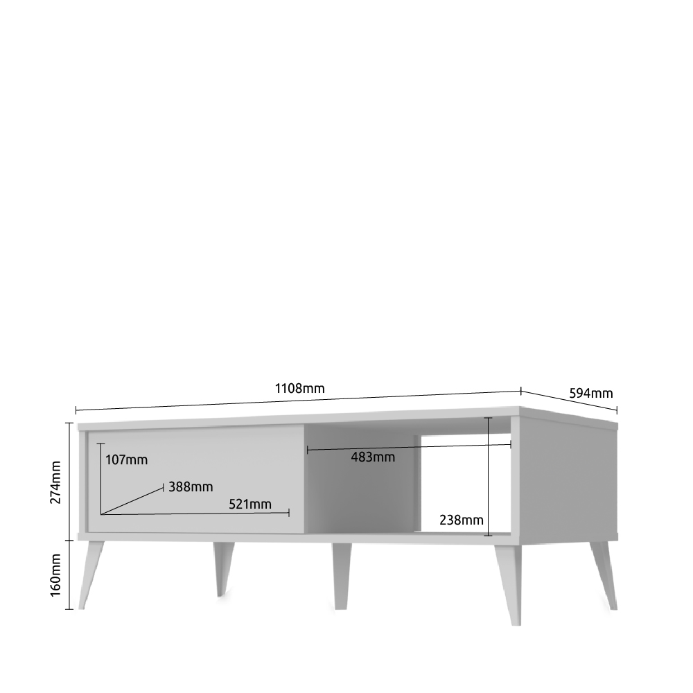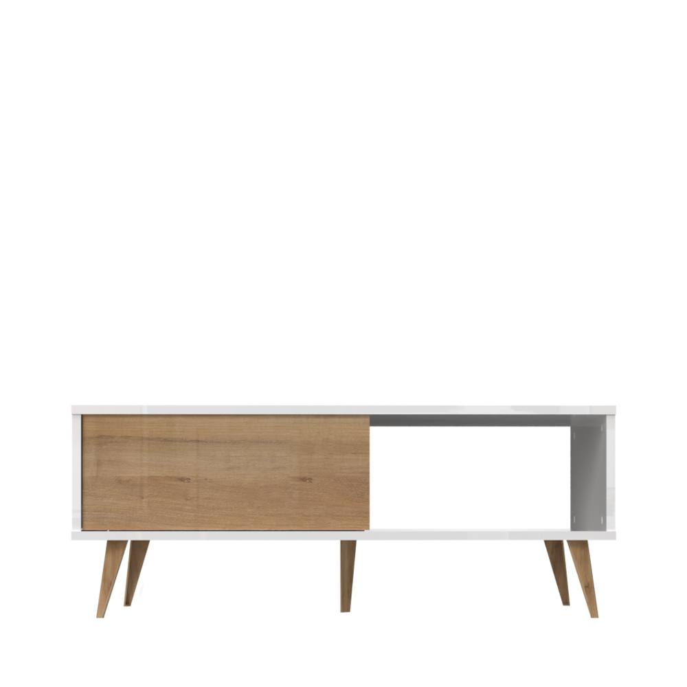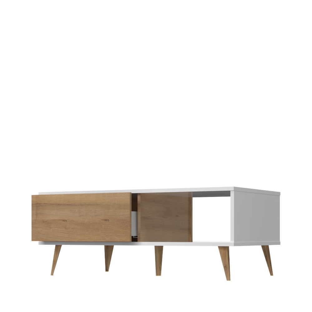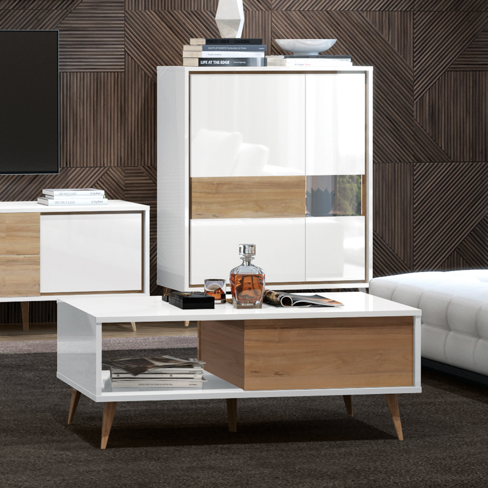 Холна маса от колекцията мебели VIDA в цвят кристално бяло с едно чекмедже в декор орех Pacific. Този елемент ще внесе духа на 60-те години във вашата всекидневна.