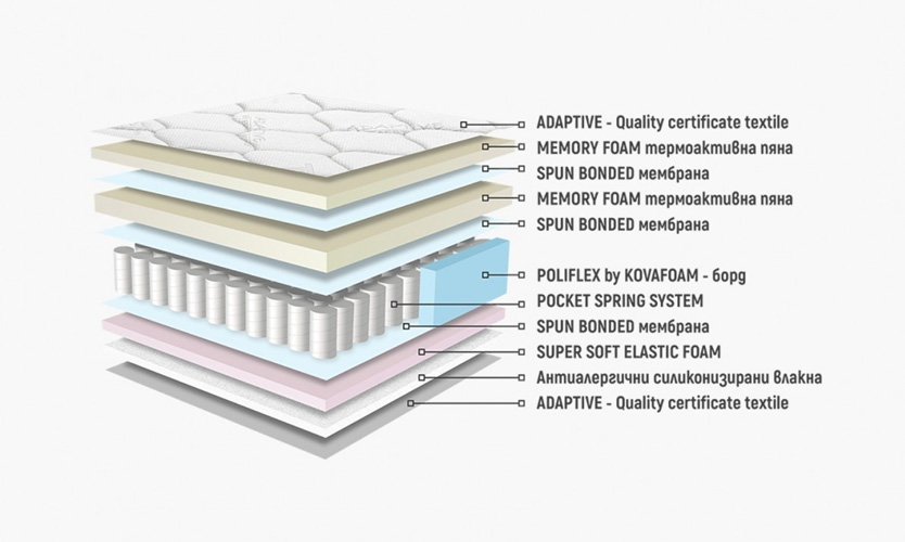 - Състав: memory foam термоактивна пяна | система от покет пружини | пенополиуретанова пяна | висококачествен сертифициран текстил