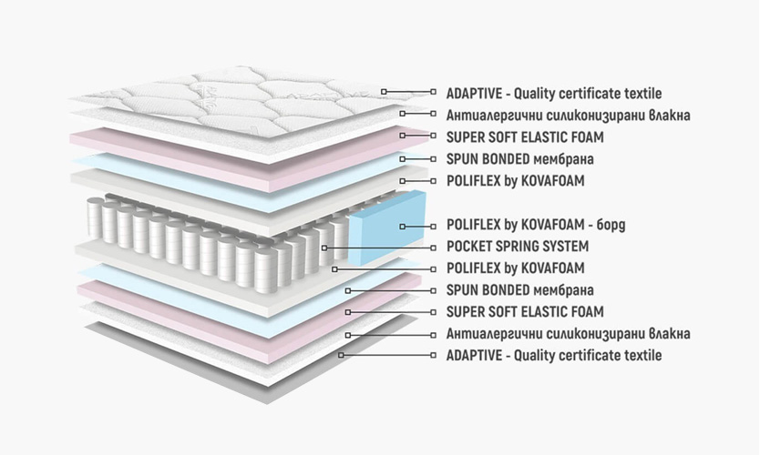 POLIFLEX рамка с висока плътност. Капитонираният с антиалергични силиконизирани влакна калъф предлага оптимален термоефект – приема и поддържа топлината на тялото. Естествено мекия сертифициран текстил ADAPTIVE въздейства благоприятно върху температурата по време на сън. Вложените висококачествени материали превръщат АРУБА ПОКЕТ в желан и търсен модел сред продуктите за сън.