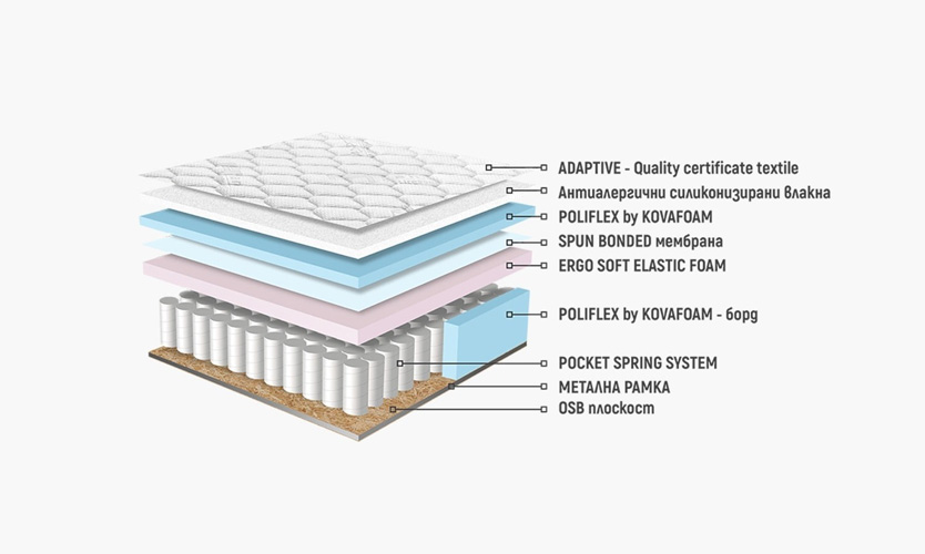 Единичните SPRINGS елементи са с определена височина и брой навивки, за гарантиране на дълготрайна мекота. За устойчивост и баланс в зоната на сядане, те са обиколени от стабилизираща рамка от POLIFLEX с висока плътност. Използваните за основа метална рамка и OSB плоскост гарантират здравина. Трупчетата за захващане на повдигащ механизъм увеличават приложимостта на матрака.