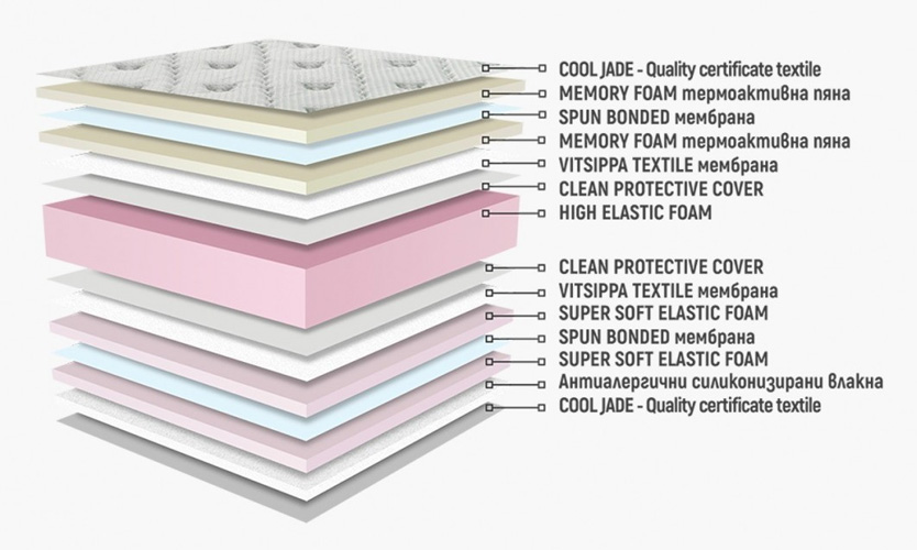 СЪРЦЕВИНА – умерено профилиран HIGH ELASTIC FOAM за балансирана ортопедична опора и голяма дълготрайност. Съставните „отворени“ микро клетки и обвиващия CLEAN PROTECTIVE COVER гарантират проветривост и стирилност в дълбочина.КАЛЪФ – заедно с 3D дишащата лента и мекия обемен Cool Fade от BEKAERT DESLEE завършват модерната визия. Делимият цип добавя функционалност и прави матрака лесен за поддържане.Комбинацията от висококачествени иновативни материали и функционалността превърнаха модела в предпочитан от ценителите на съня и здравословната почивка. Запомнящата се термоактивна плътност на MEMORY или галещата мекота на SUPER SOFT активират всички рецептори и прилагат специфично усещане за комфорт и релакс.