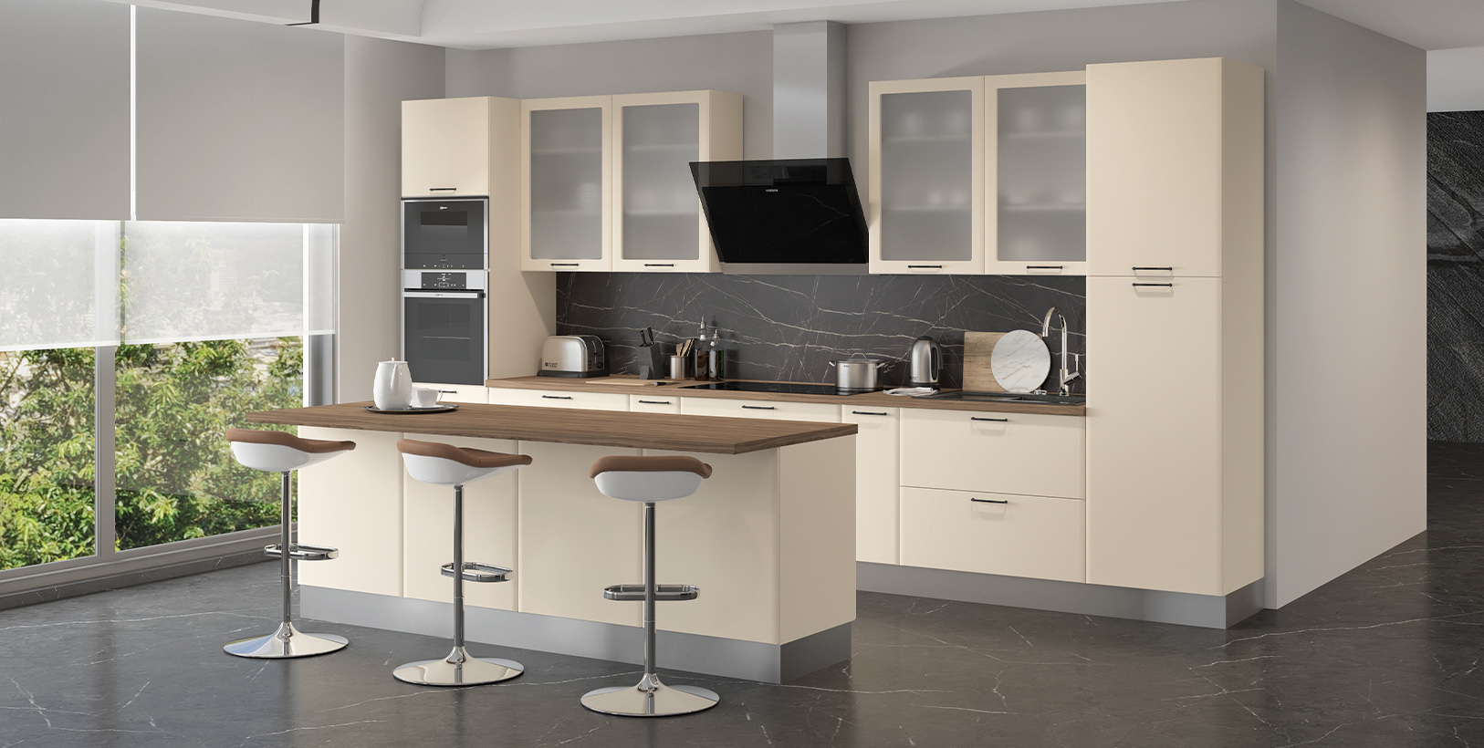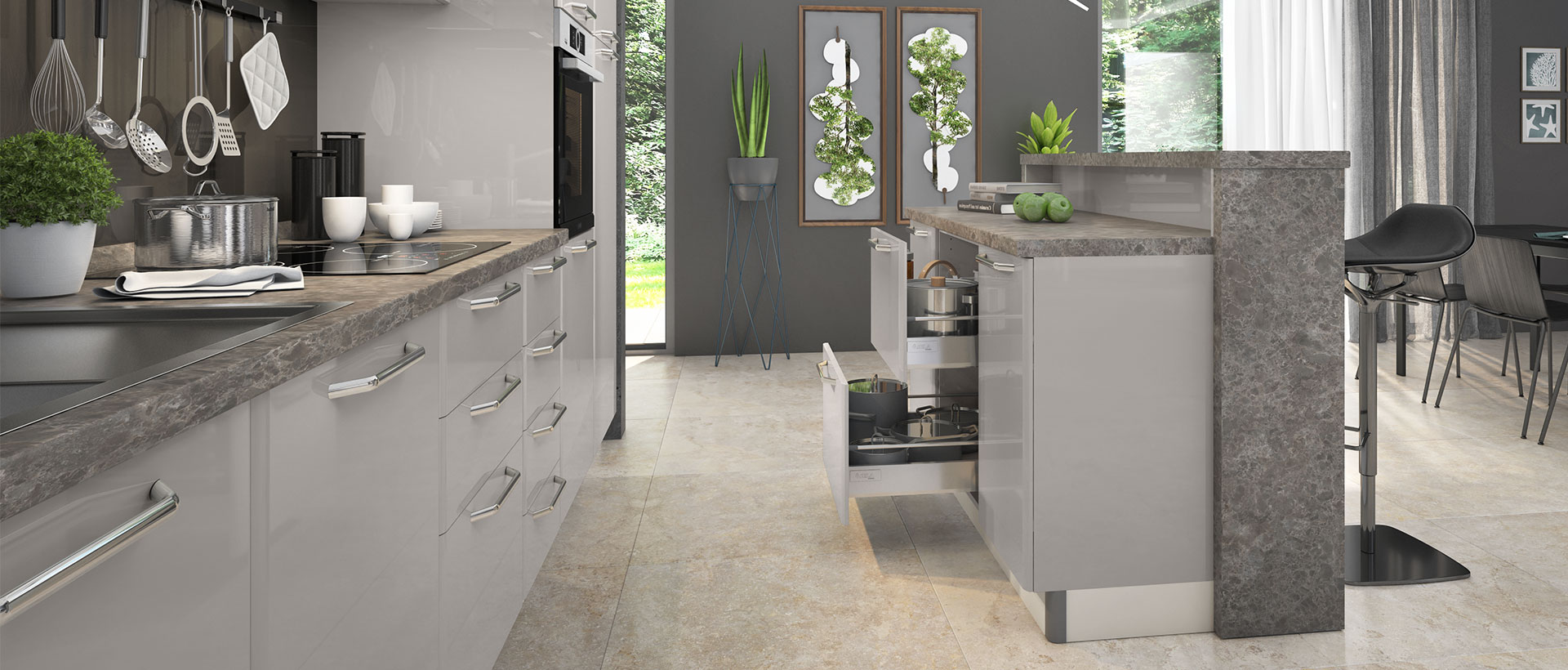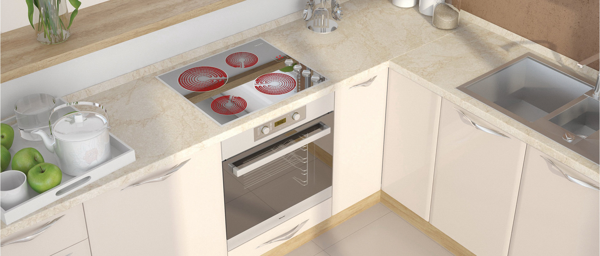 Чекмеджета са с механизми за плавно прибиране, пантите с плавно затваряне, наличие на модул с издърпващ помощен плот. MDF двустранно покритие на лицето+ използвана най-добрата технология за боядисване на фронта с нанасяне на UV лаково покритие..