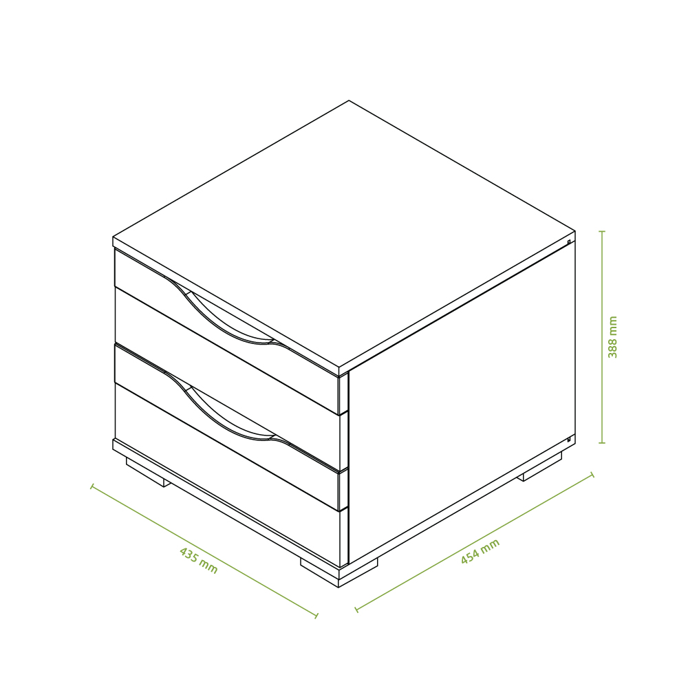 Лицевата част на чекмеджето, както и корпусният елемент са изработени от ПДЧ в дървесен декор Бял бор