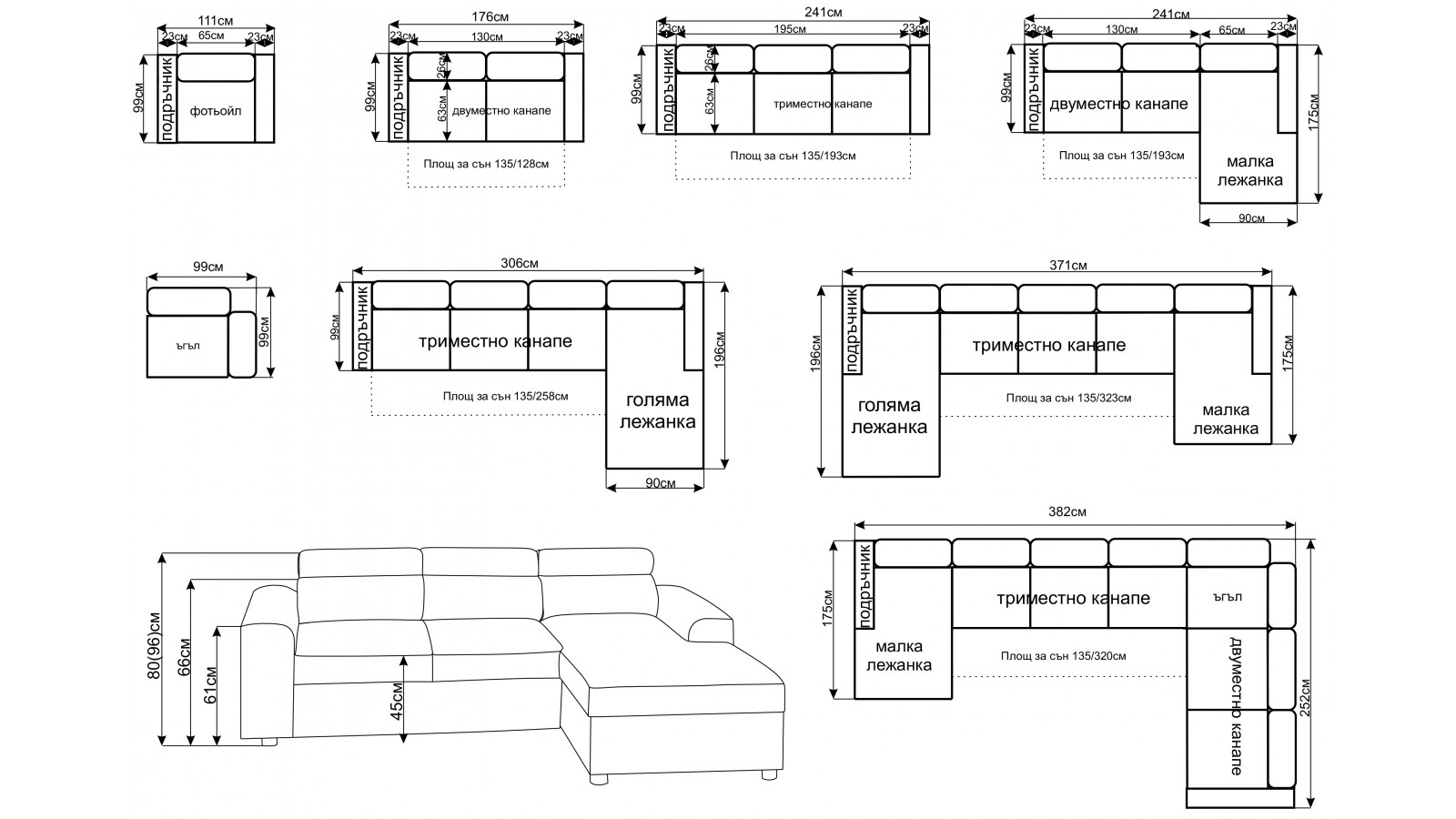 Малка лежанка с подръчник+ Триместно канапе с механизъм+Ъгъл+Двуместно канапе с ракла+Подръчник