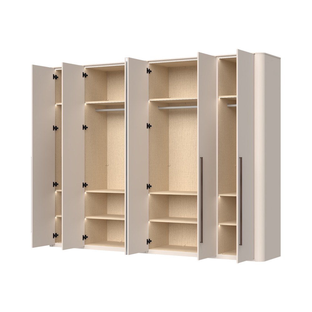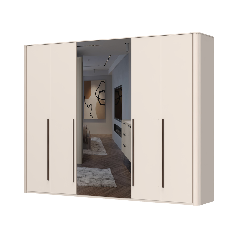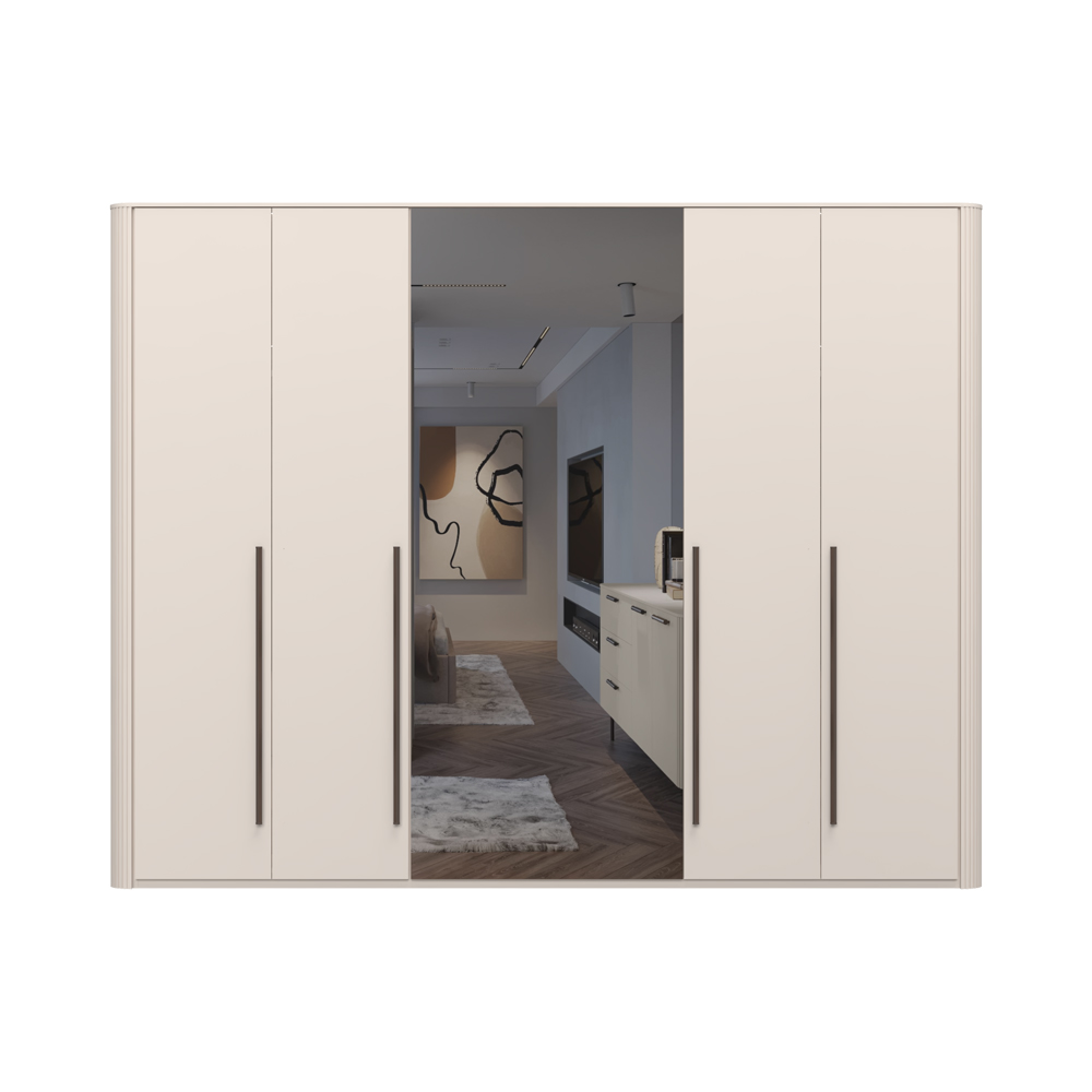 Гардероб с 6 врати: 4 покрити с мек матов UV лак в цвят кашмир и 2 огледални