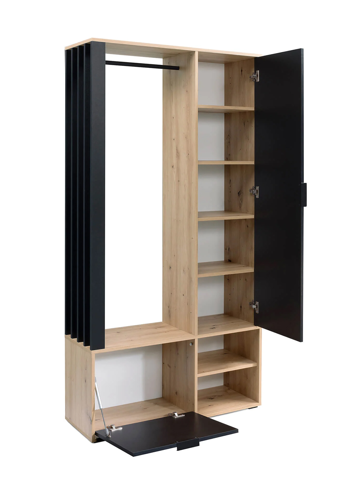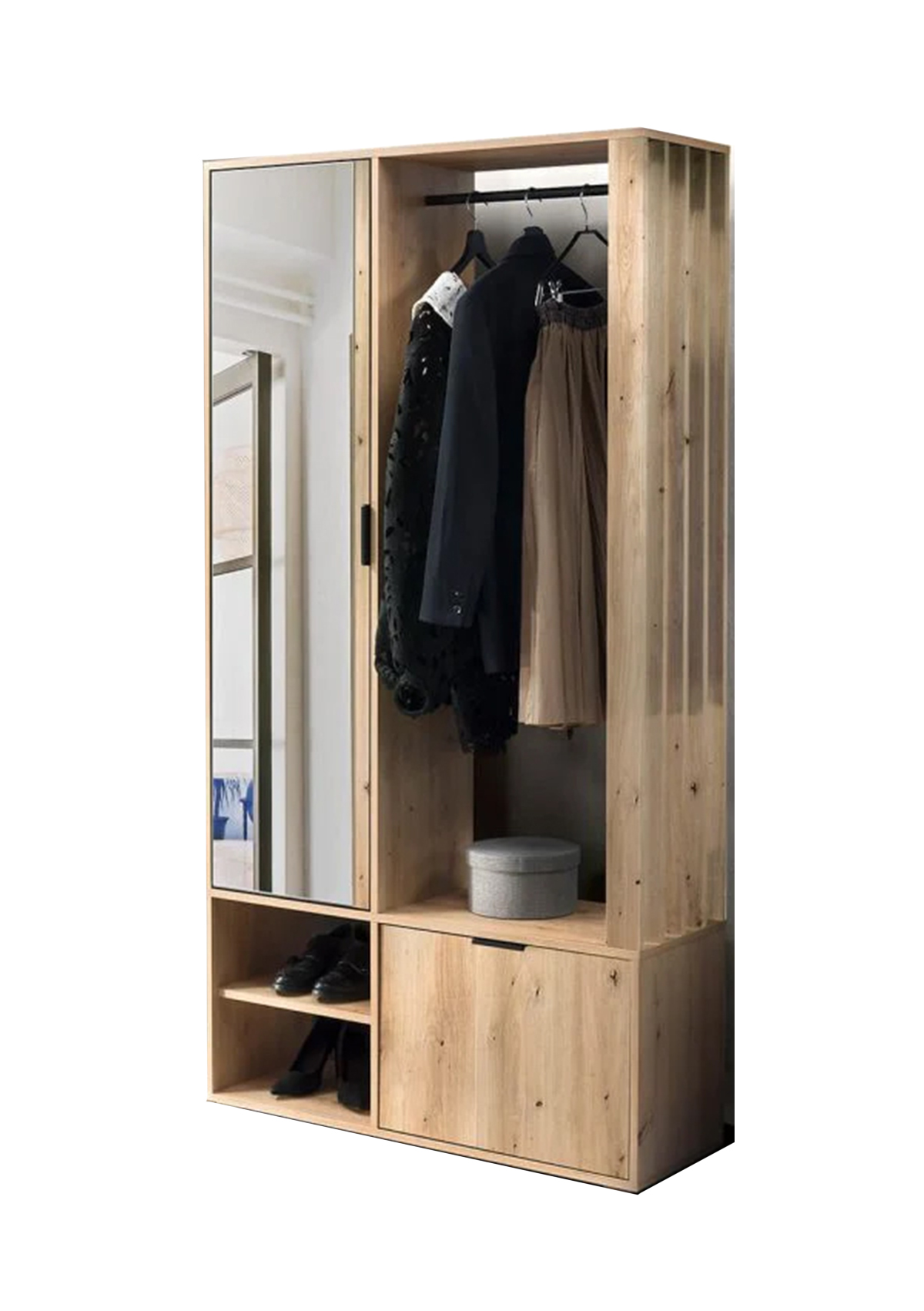 Портмантото е с огледало, закачалка и шкаф за обувки.