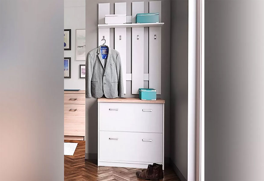 Предлага ползването на шкаф за обувки с две отделения, пано с четири закачалки и висока етажерка, подходяща за поставяне на шапки и други принадлежности.