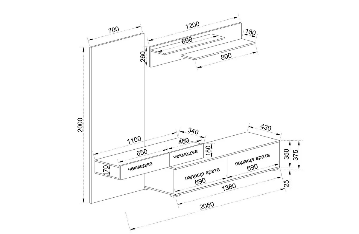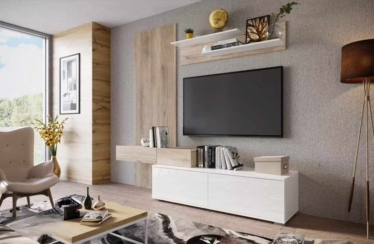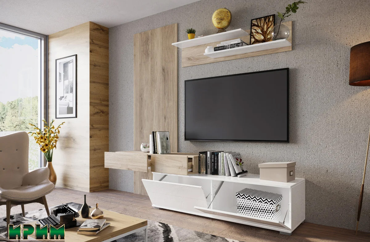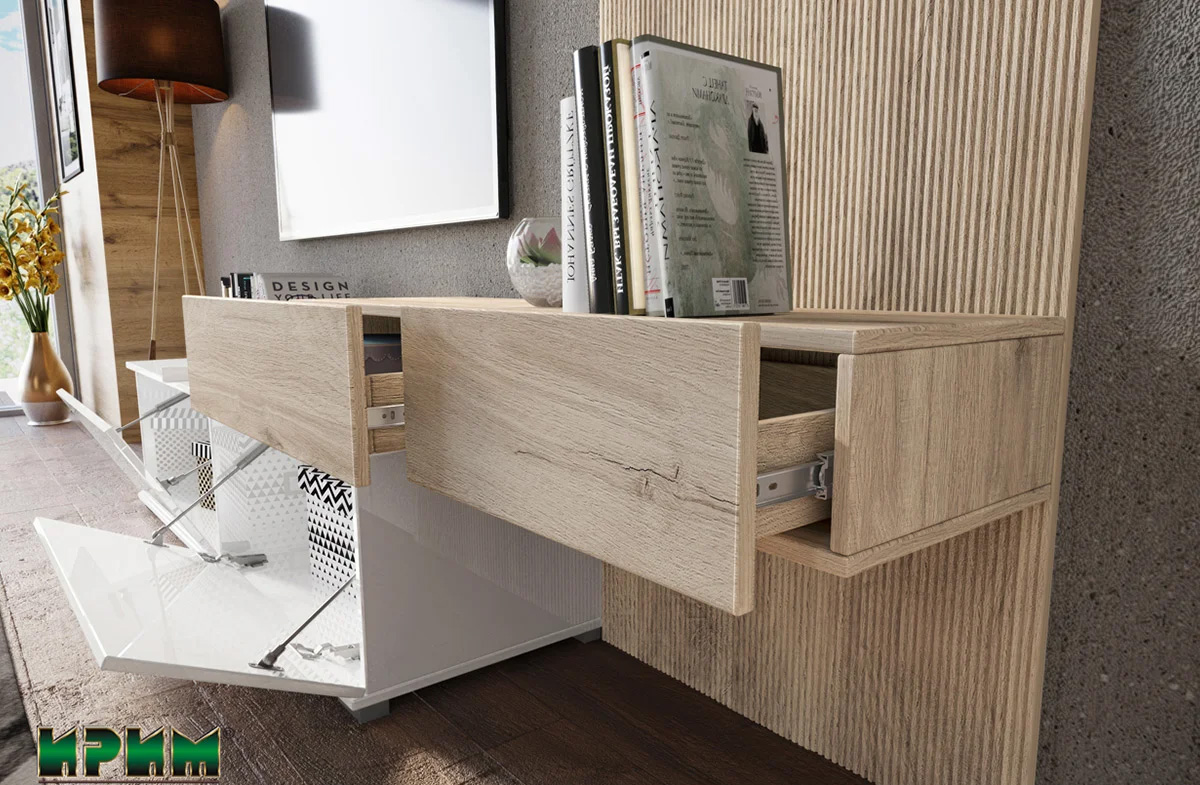 Ново и различно бижу за дневната с вертикални зарязвания, които са много актуални в днешно време. Секцията дава възможност паното и чекмеджетата да се монтират както отлявата, така и отдясната страна на ТВ шкафа.