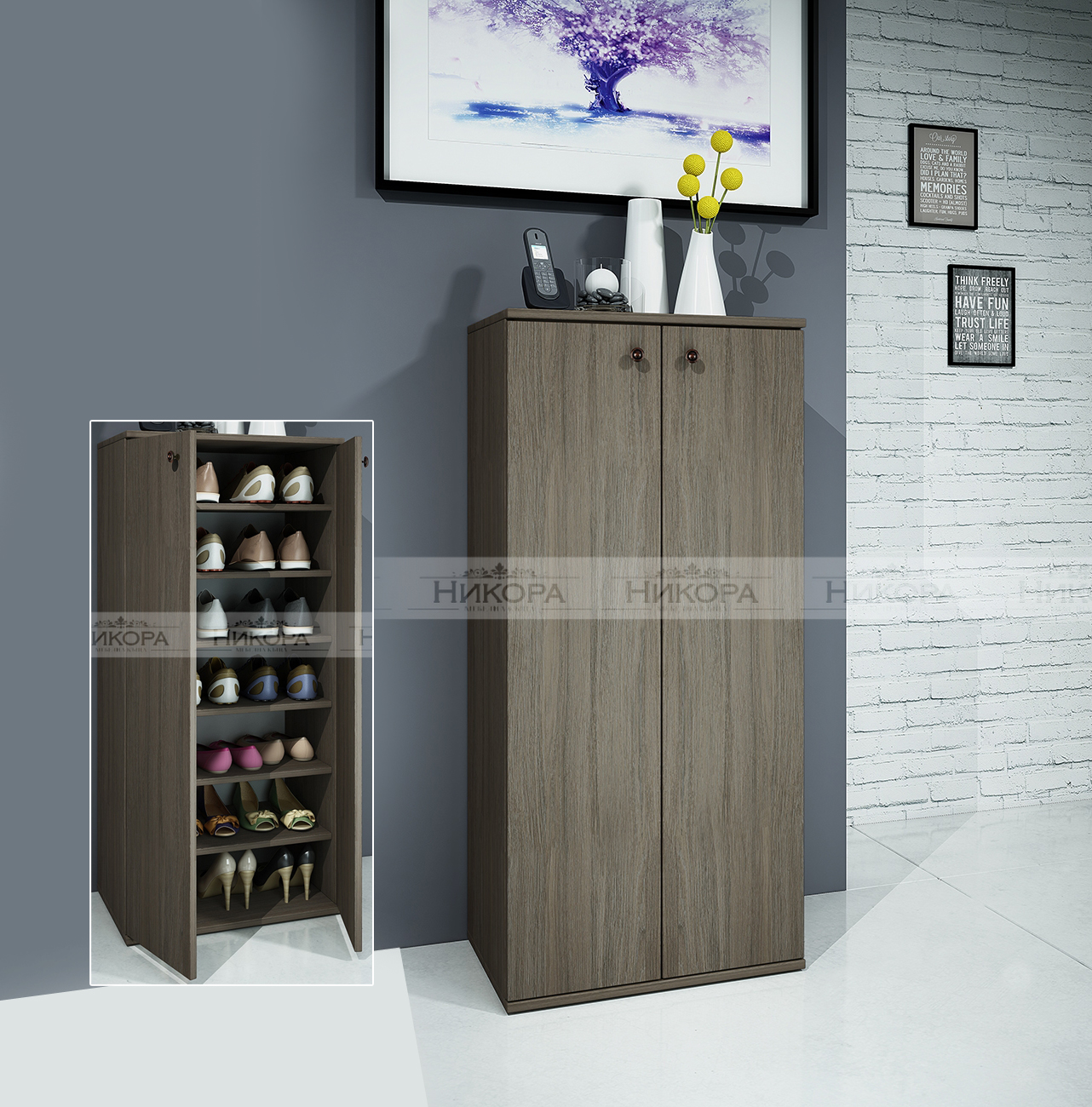 Шкафа събира от 14 до 18 чифта обувки, в цената не са включени декоративни елементи от снимката.