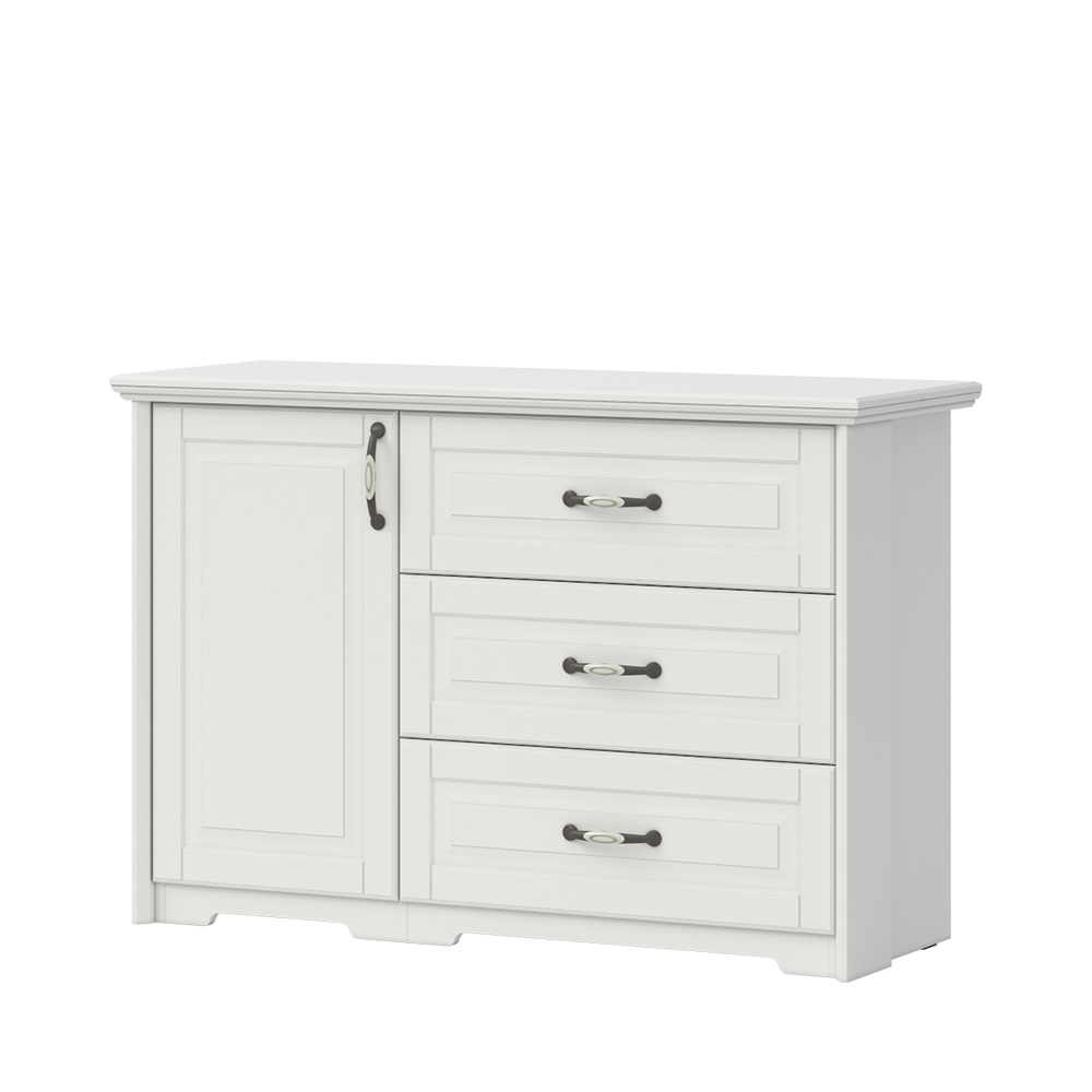 Рустик, стилен и функционален скрин за съхранение на дрехи. Скринът е с една врата, която е винаги от лявата страна на елемента и три чекмеджета.