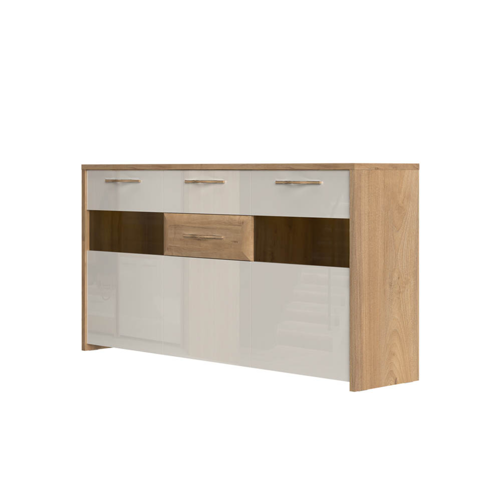 Вратите и челото на горното чекмедже са лакирани с UV лак супер гланц, в топъл бежов цвят