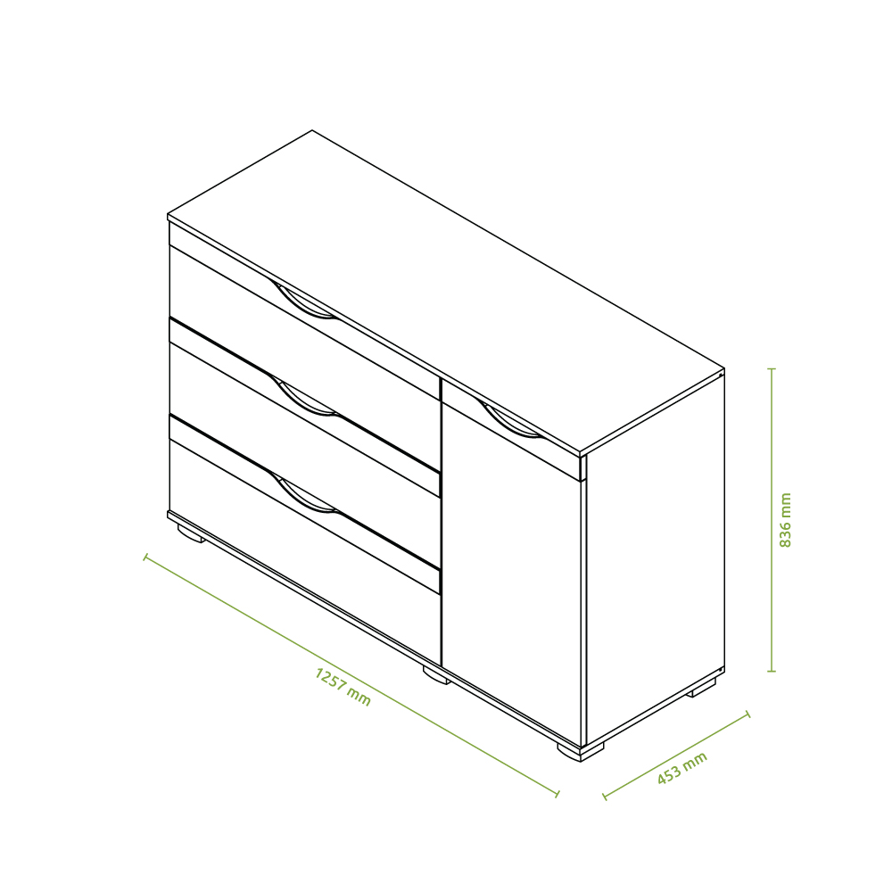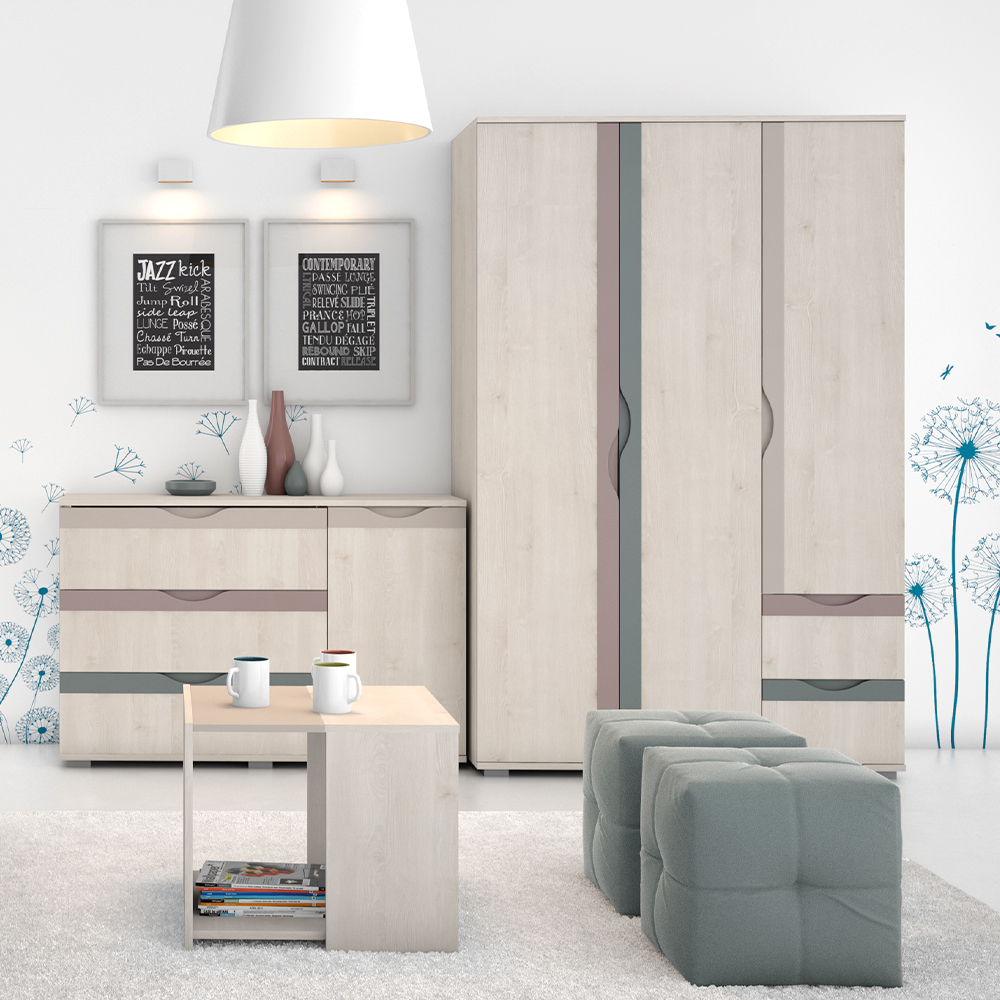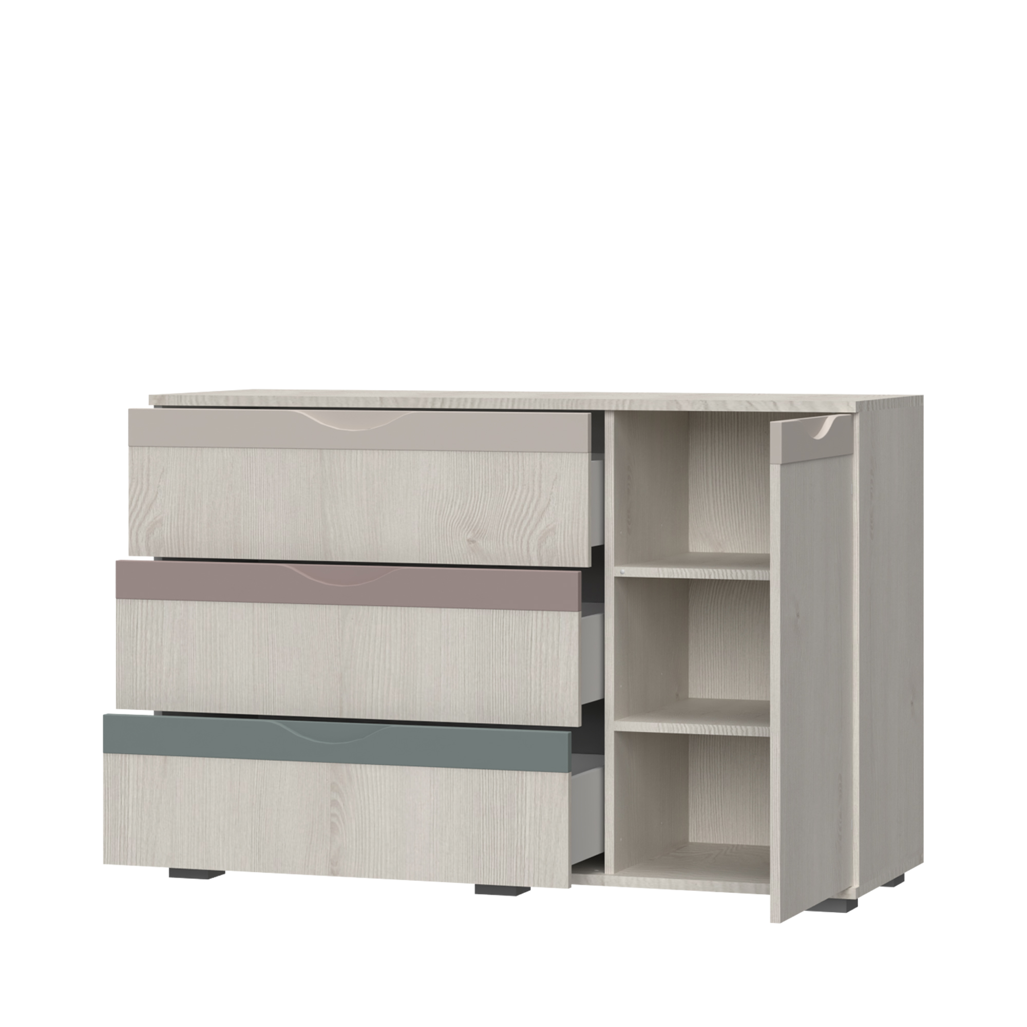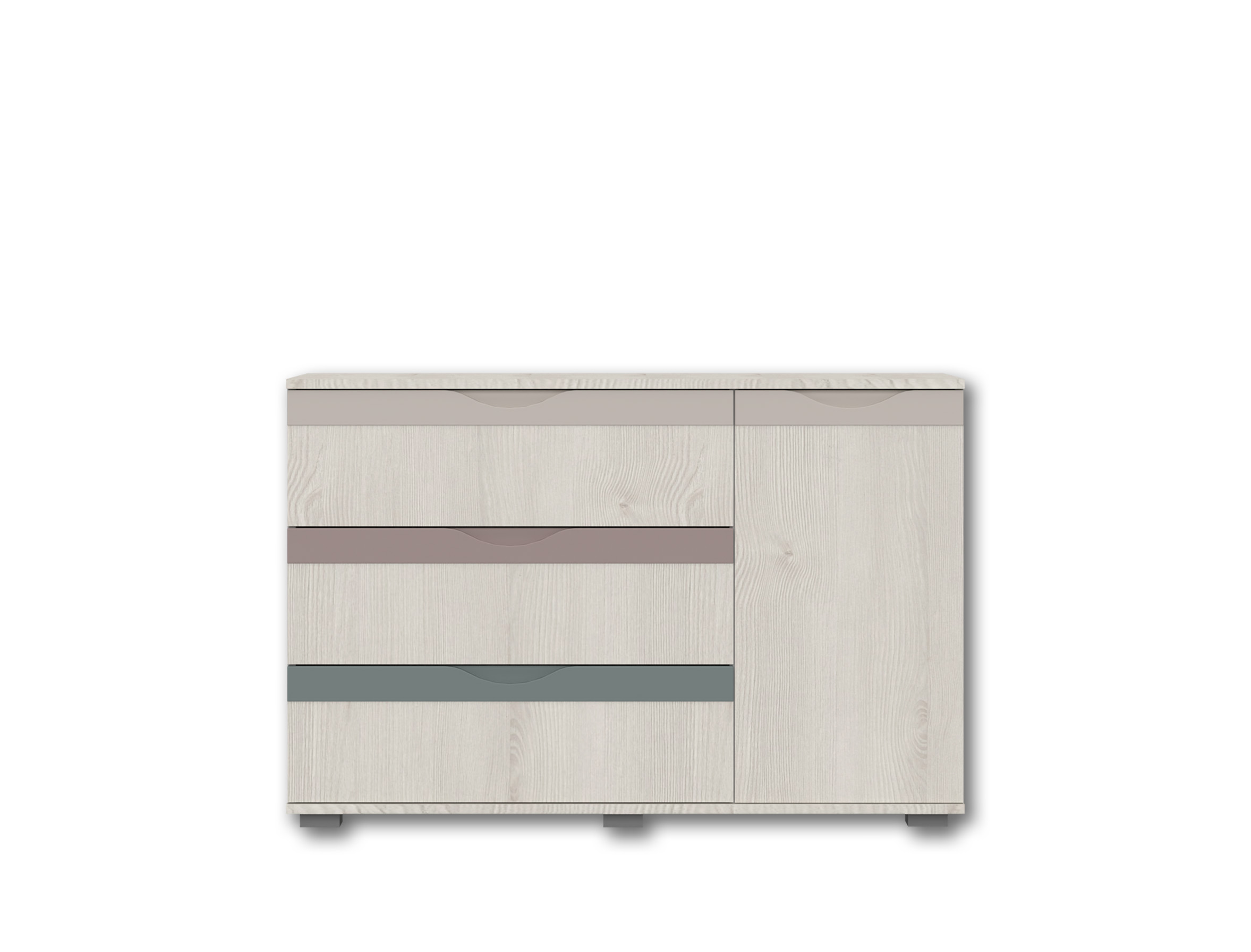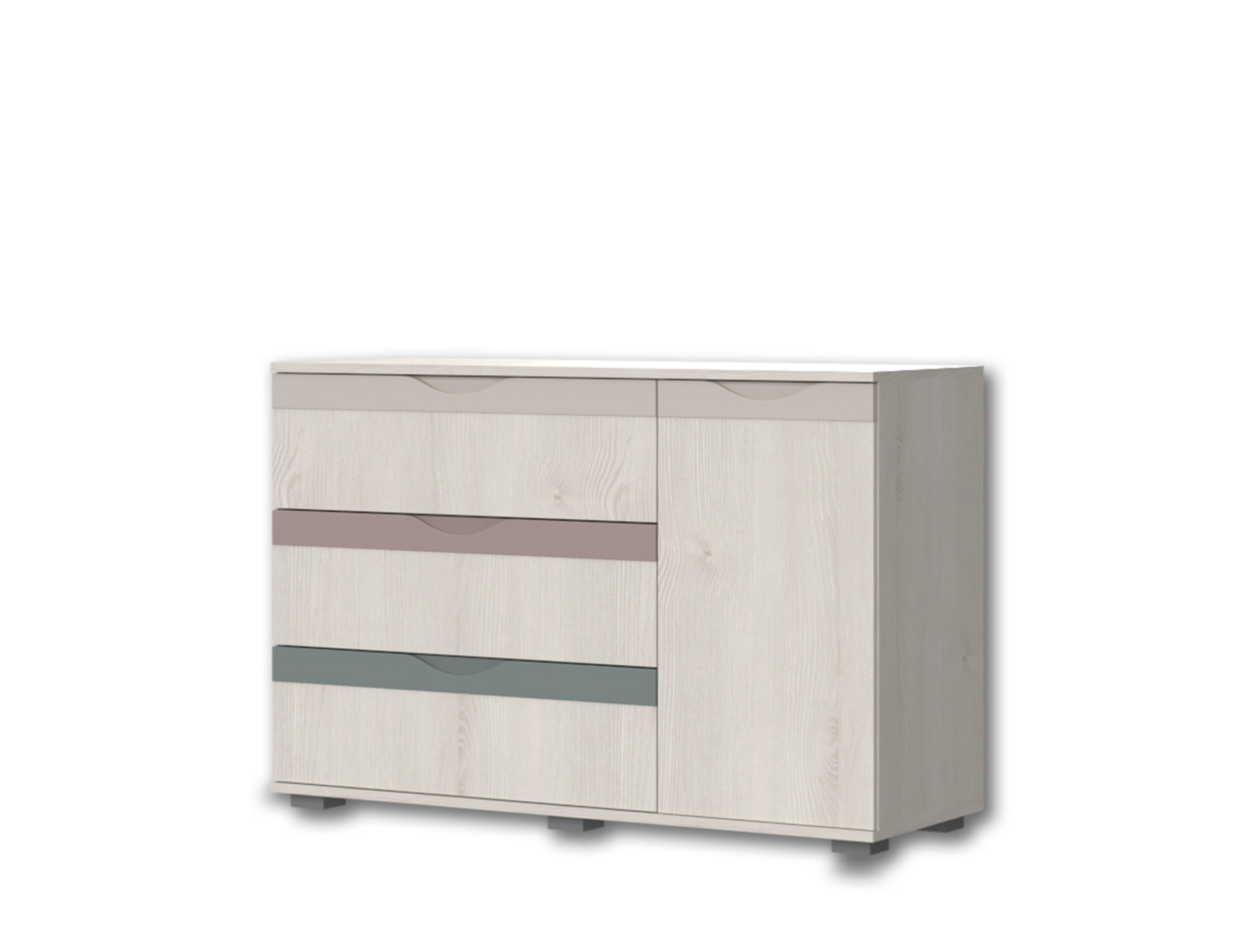 Скрин за детска спалня от колекция JOY с една врата и три чекмеджета с декоративни дръжки от МДФ в различни цветове.