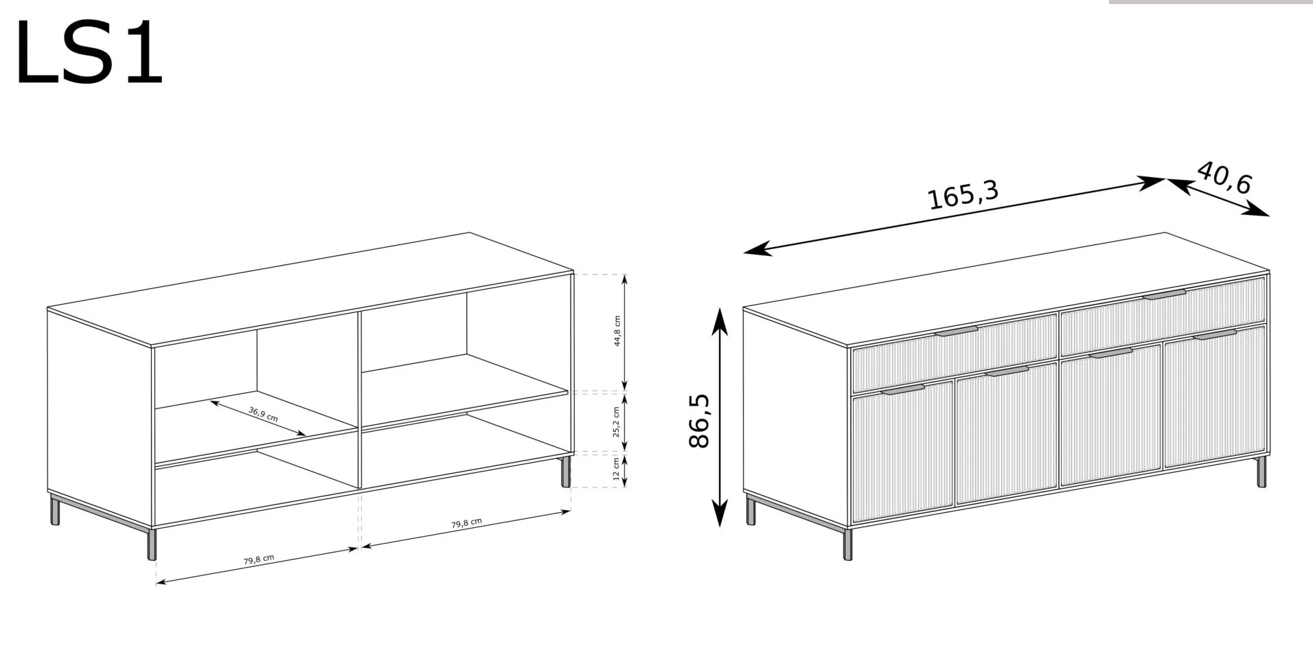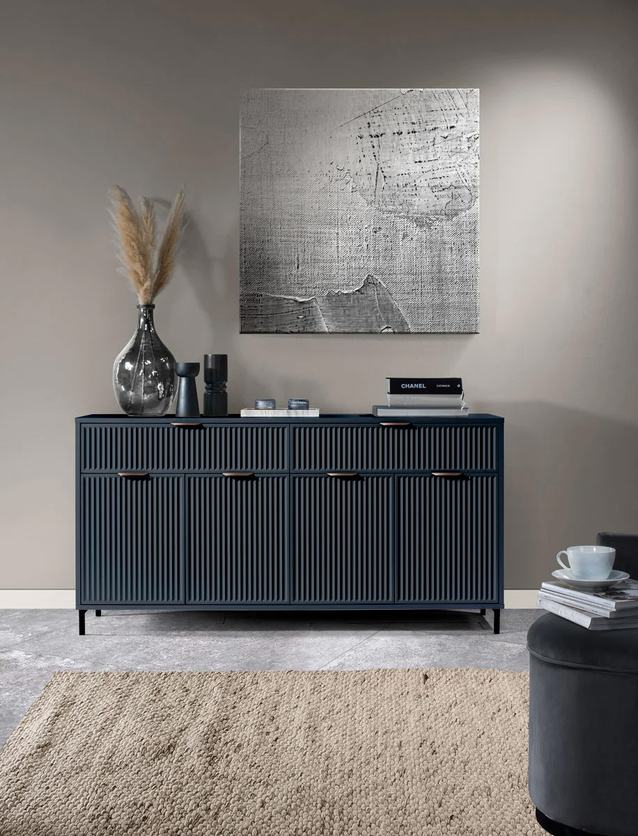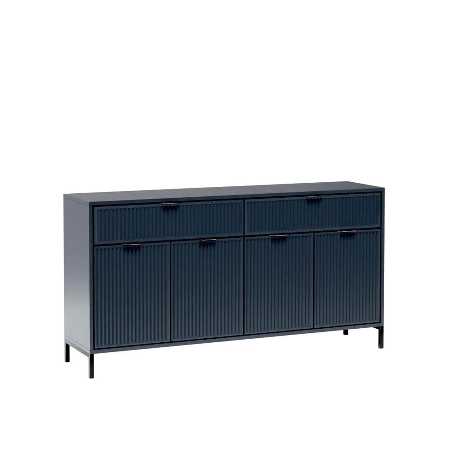 Дизайнерски скрин, който идеално ще пасне на всеки хол, трапезария, кабинет или офис. В горната част на тази мебел ще намерите две големи чекмеджета за дрехи, аксесоари, документи, благодарение на които тя става многофункционална. В шкафовете ще откриете два големи рафта, които ще позволят лесна организация. Предлага се в три цвята.