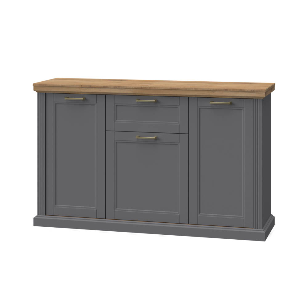 Лицето на шкафа е изработено от резбован MDF, изцяло покрит с UV лак на водна основа с мек матов ефект в графитен или бял цвят.
