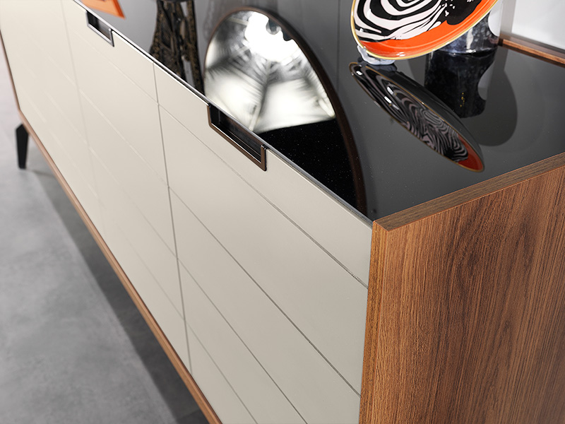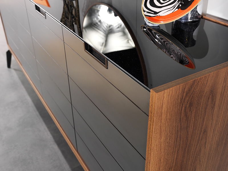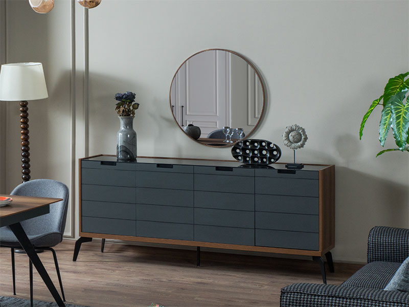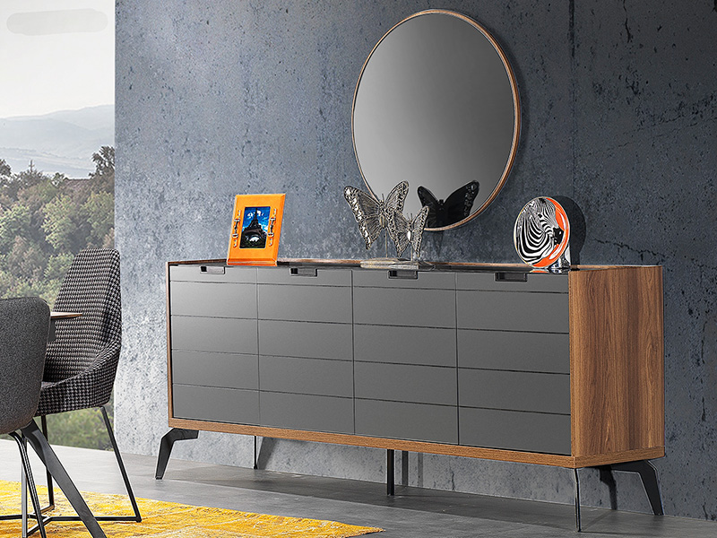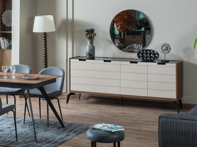 Модерен скрин подходящ за всекидневна и трапезария. Скринът е част от модулна система ZETT2MDF, като е наличен и във вариант в сиво и бежово. В цената му е включено и огледало за окачване на стена. Шкафът е с корпус и лица изработени от MDF. Корпусът е покрит с ламинат в дървесен декор а лицата са боядисани с матова боя. За лицата са характерни хоризонталните декоративни канали, както и вкопаните метални дръжки, които придават минималистичен стил на скрина. Таванът е изработен от стъкло в черен цвят. Пантите са с плавно затваряне. Краката са метални и достатъчно високи, да осигуряват лесен достъп за почистване под скрина. Вътрешното пространство е разделено на две по височина с рафтове.