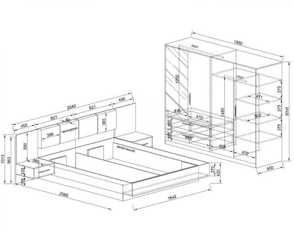 Легло, табла и нощни шкафчета: 2545 / 2060 / 1025 мм