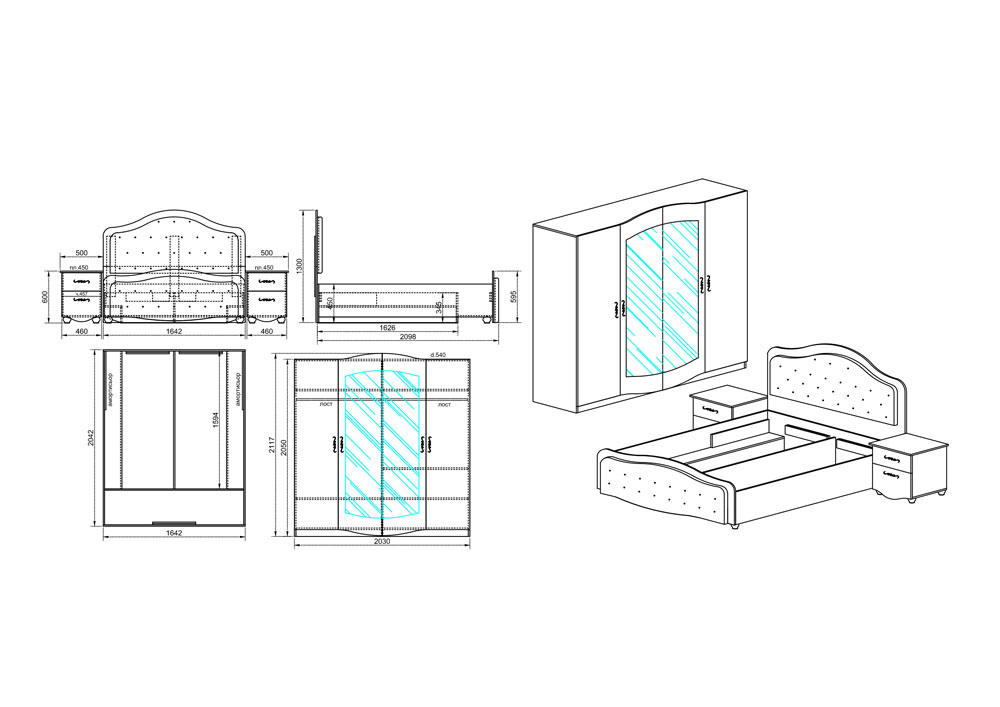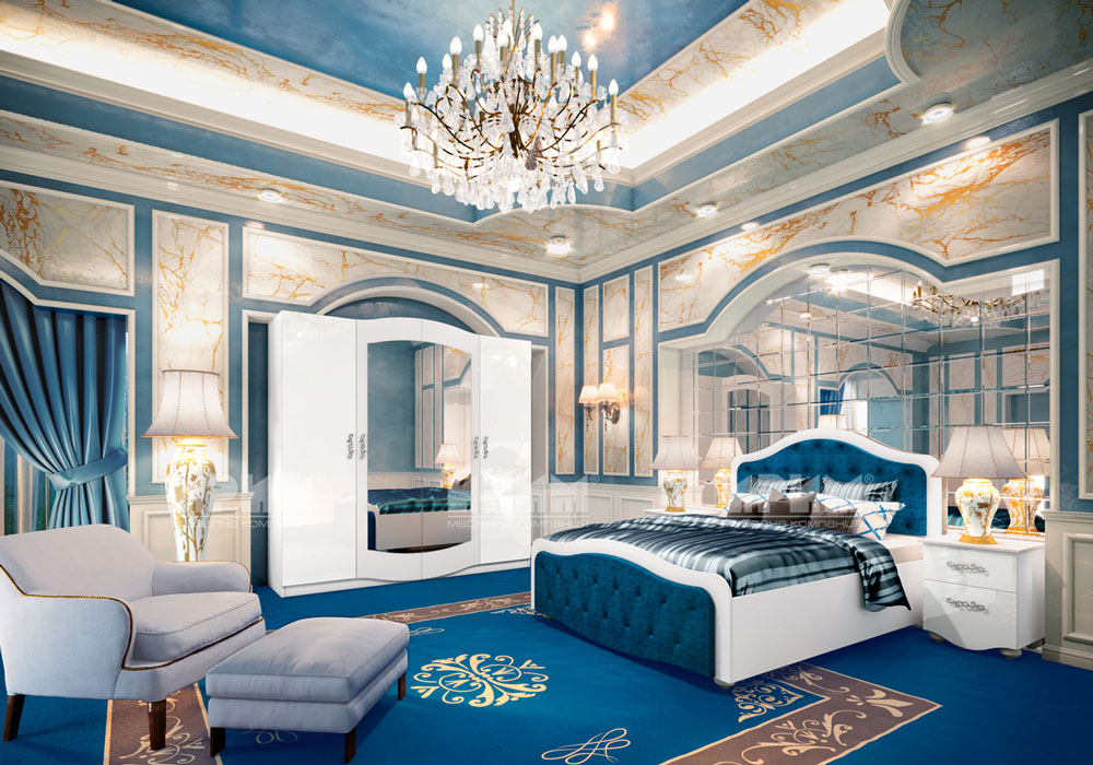Спален комплект Сити 7034 може да се категоризира с две думи – изящество и стил. Таблата и луба са тапицирани в кралско син плат. Доста от елементите имат извивки, което прави комплекта модерен и различен Преобладават елементи с мдф.