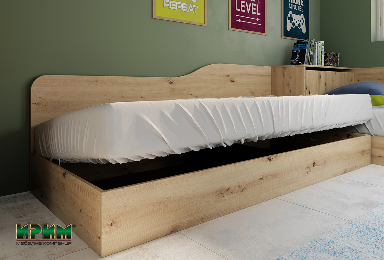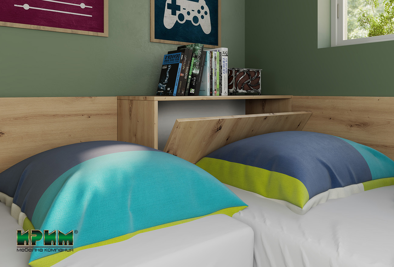 Спалнята може да се окомплектова с еднолицев и с двулицев матрак посредством ламелна рамка.