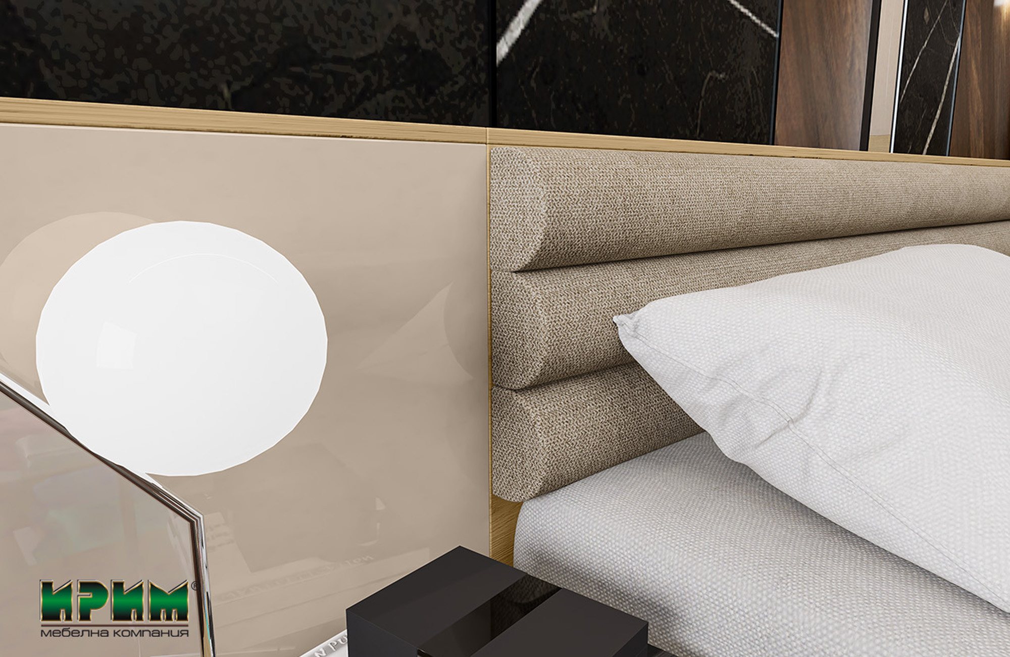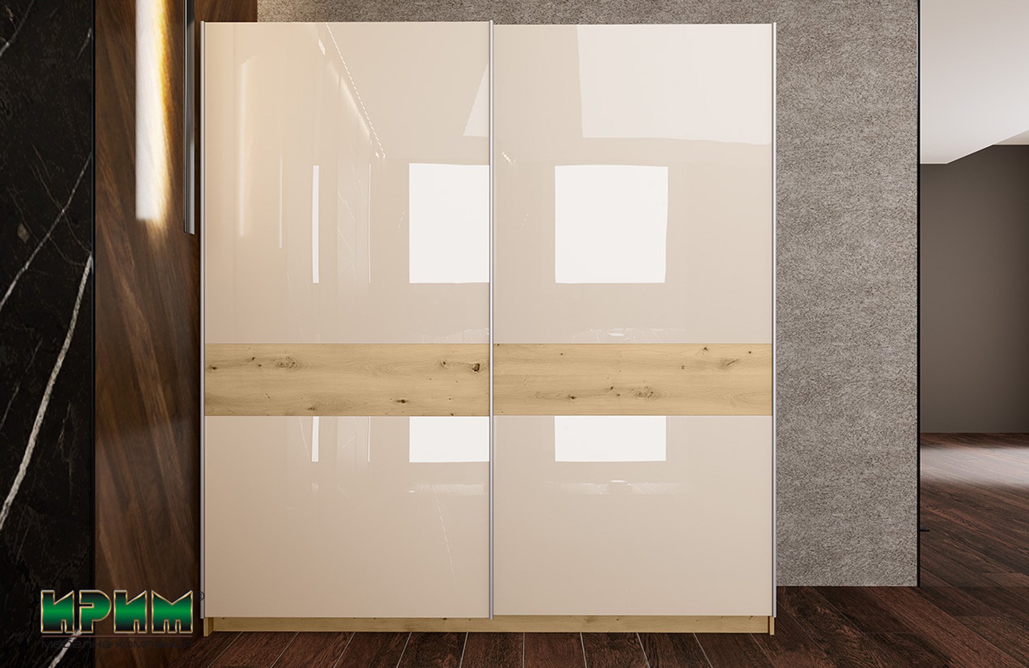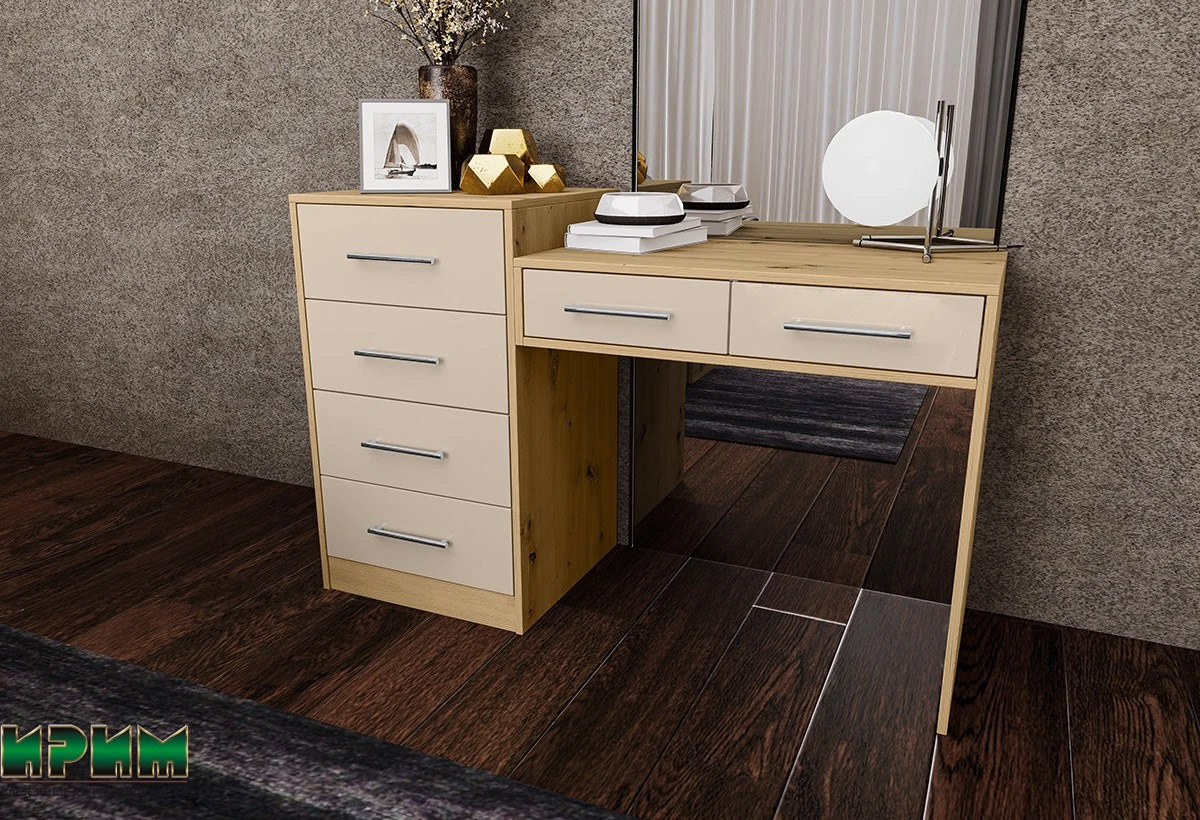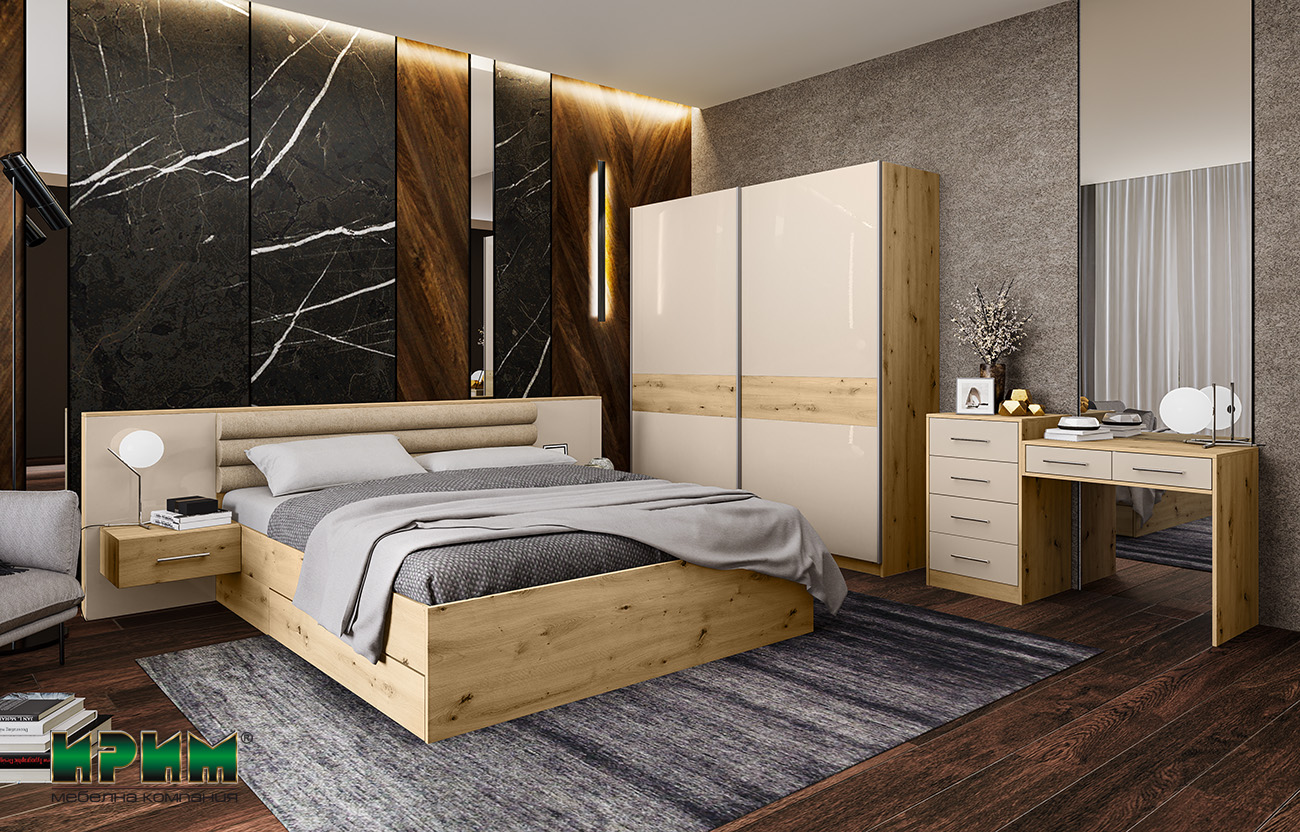 Цветовата комбинация от дъб артизан и МДФ кашмир гланц създава интересна игра на текстури и отражения, като добавя луксозен и съвременен вид на спалнята. Цвят дъб артизан придава топлина и естествен вид, докато кашмир гланцът добавя благороден блясък и изисканост.