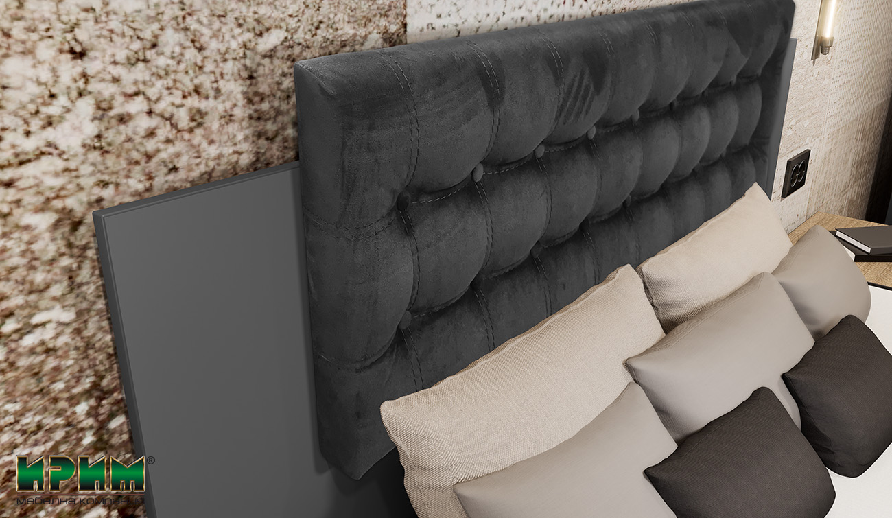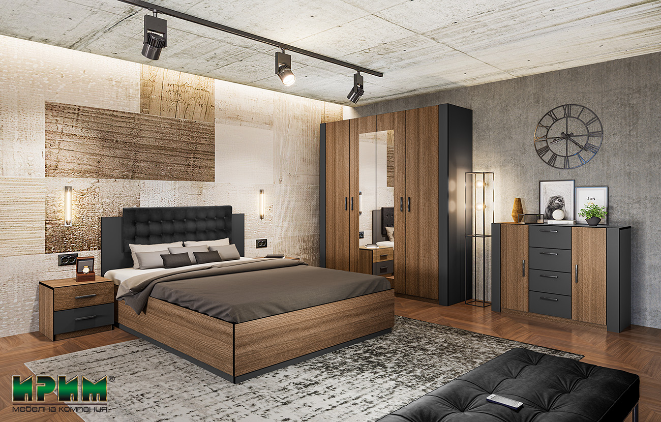 За любителите на стилните и тъмни мебели предлагаме спален комплект с нов дървесен декор Песаро, който крие уникални нишки в стил рибя кост. Леглото има повдигащ механизъм и интересна тапицирана табла, която включва копчета и лицеви шевове за повече детайлност и отличаваща се визия. Друга разлика е контрастния кант в черен цвят, който добавя интересна нотка към черната тапицерия. Гардеробът е четирикрил с 2 огледала в центъра си. Скринът е включен в комплекта. Всички отваряеми врати имат плавно прибиране.