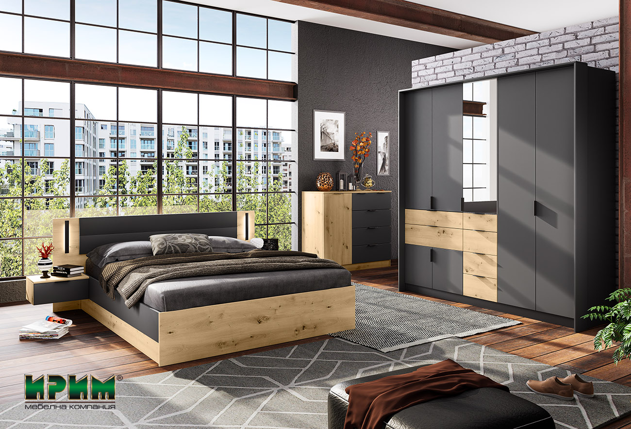 С нововъведен декор дъб артисан e постигната модерна и изчистена визия на спалния комплект Сити 7081. Спалнята има включен повдигащ механизъм и много интересно метално лед осветление на таблата. Гардеробът е изключително комплексен и включва много различни пространства с лостове, рафтове и многобройни чекмеджета. Скринът е част от комплекта.