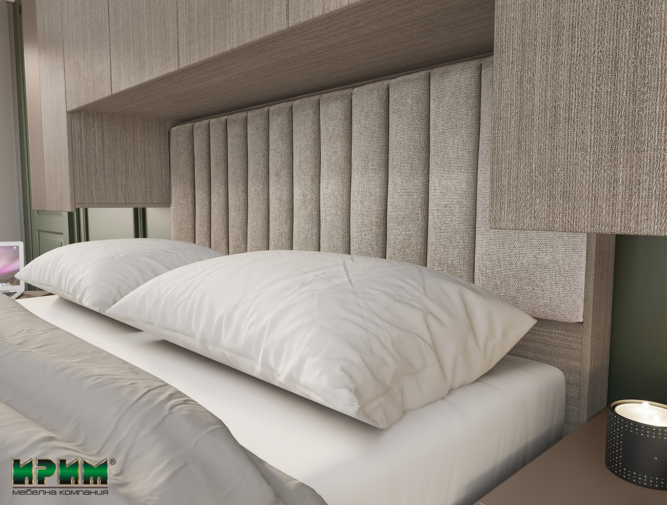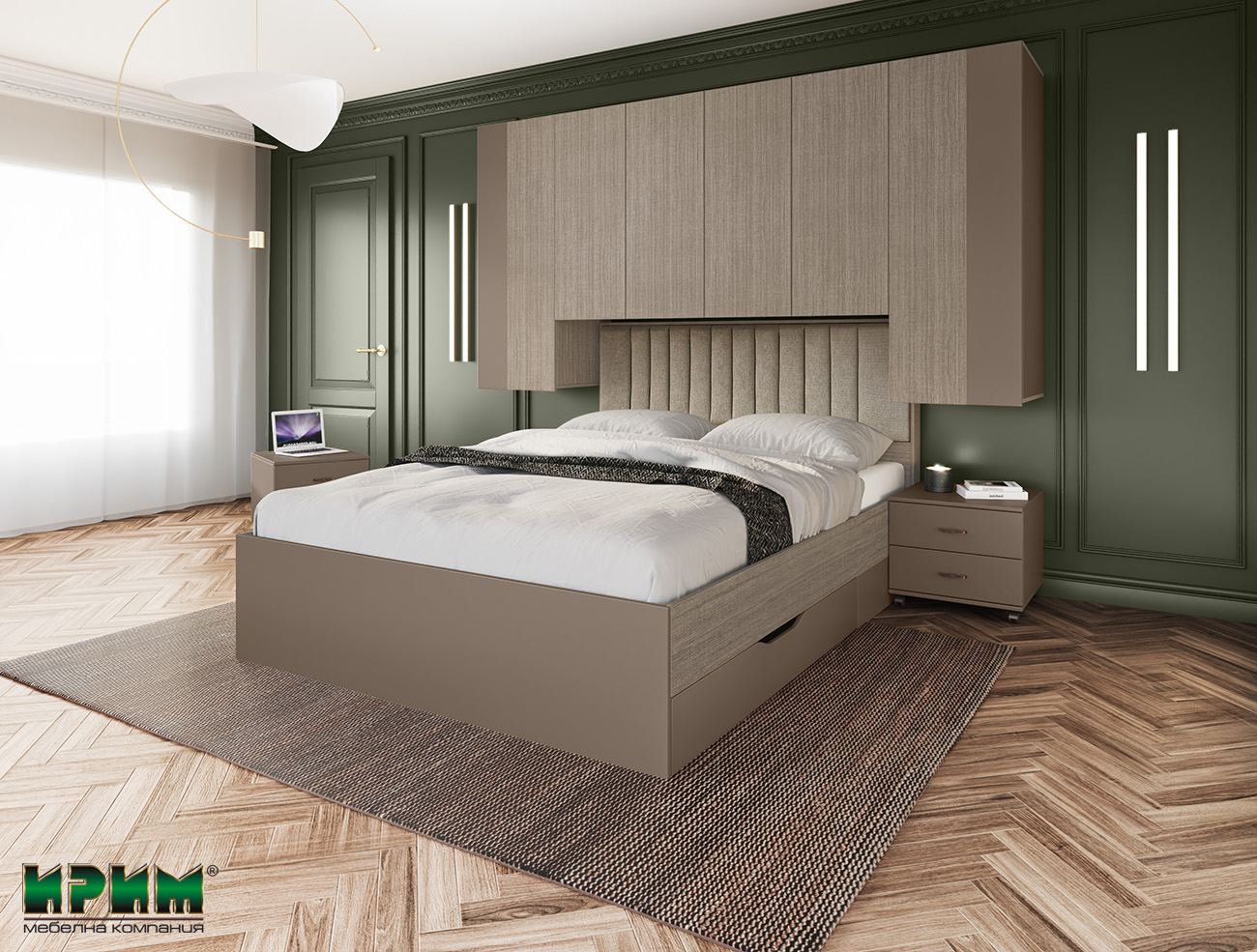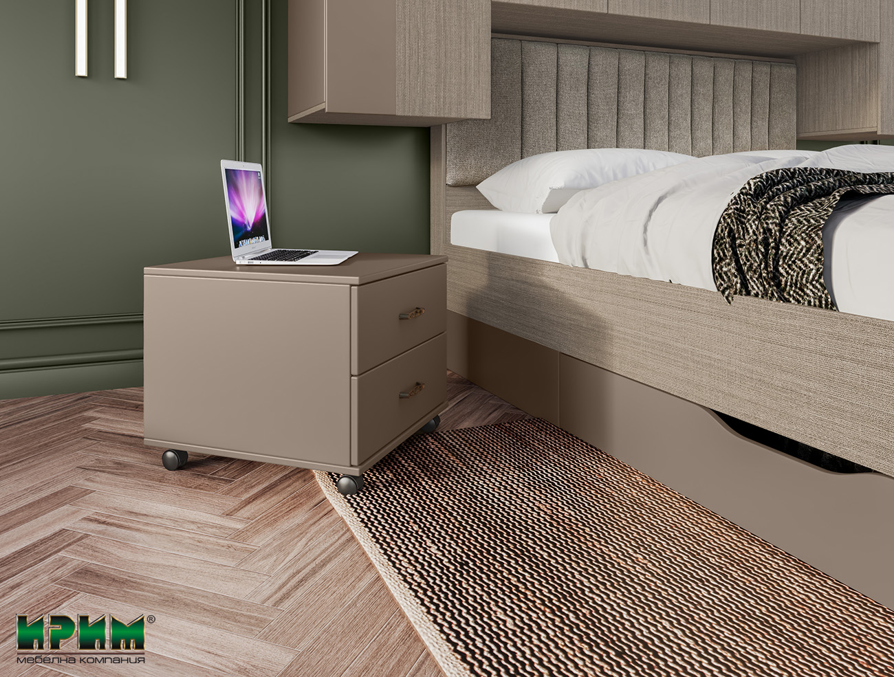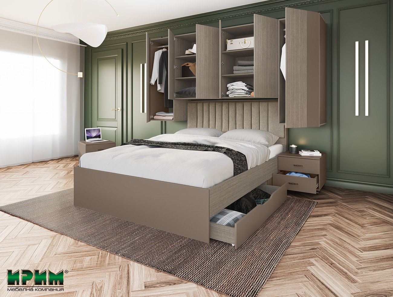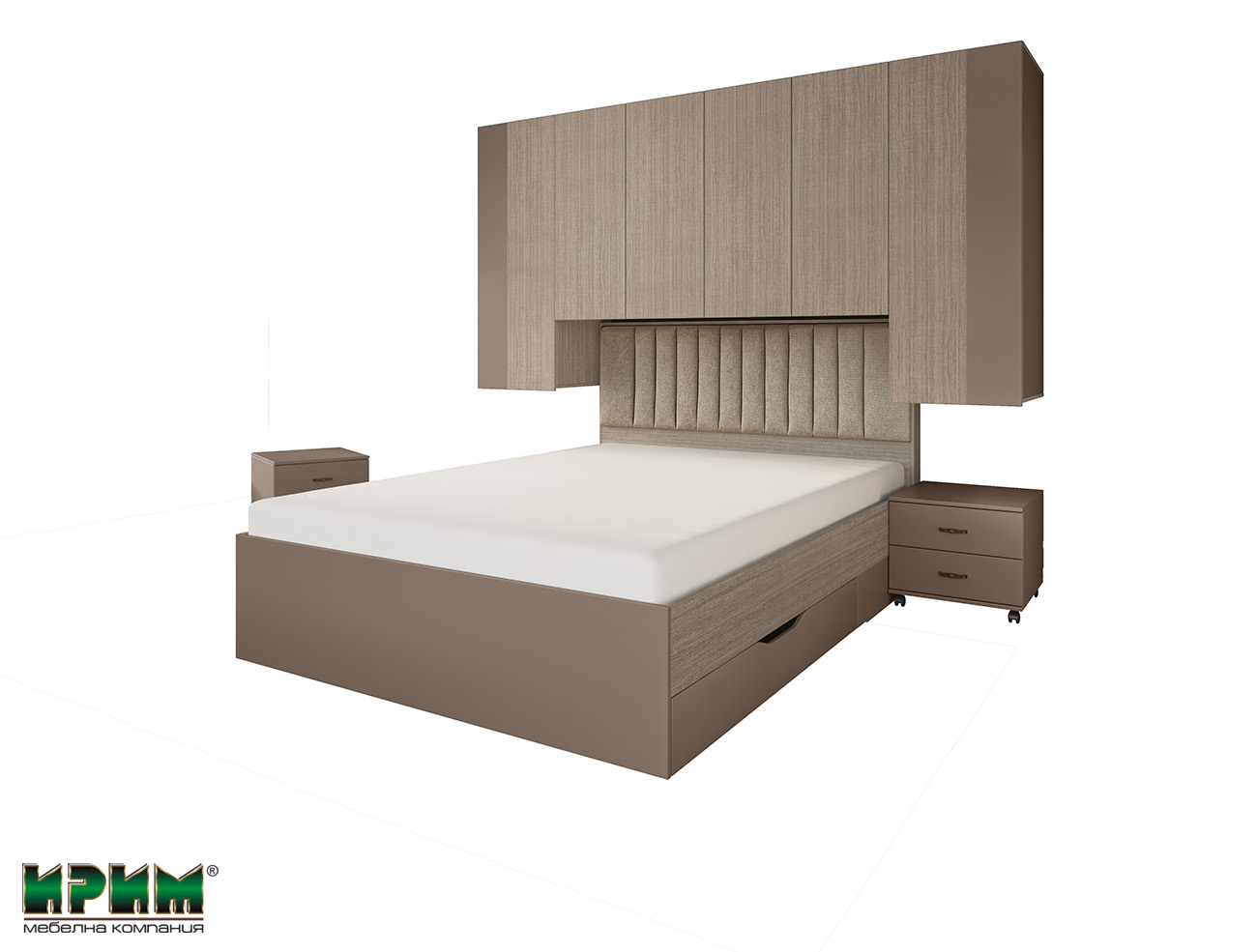 – Легло Сити 2046 – удобно и практично легло за матрак 160/200 с високи лубове и тапицирана табла в бежова дамаска, две странично отварящи се чекмеджета за лесен достъп и управление на складовото пространство под матрака .