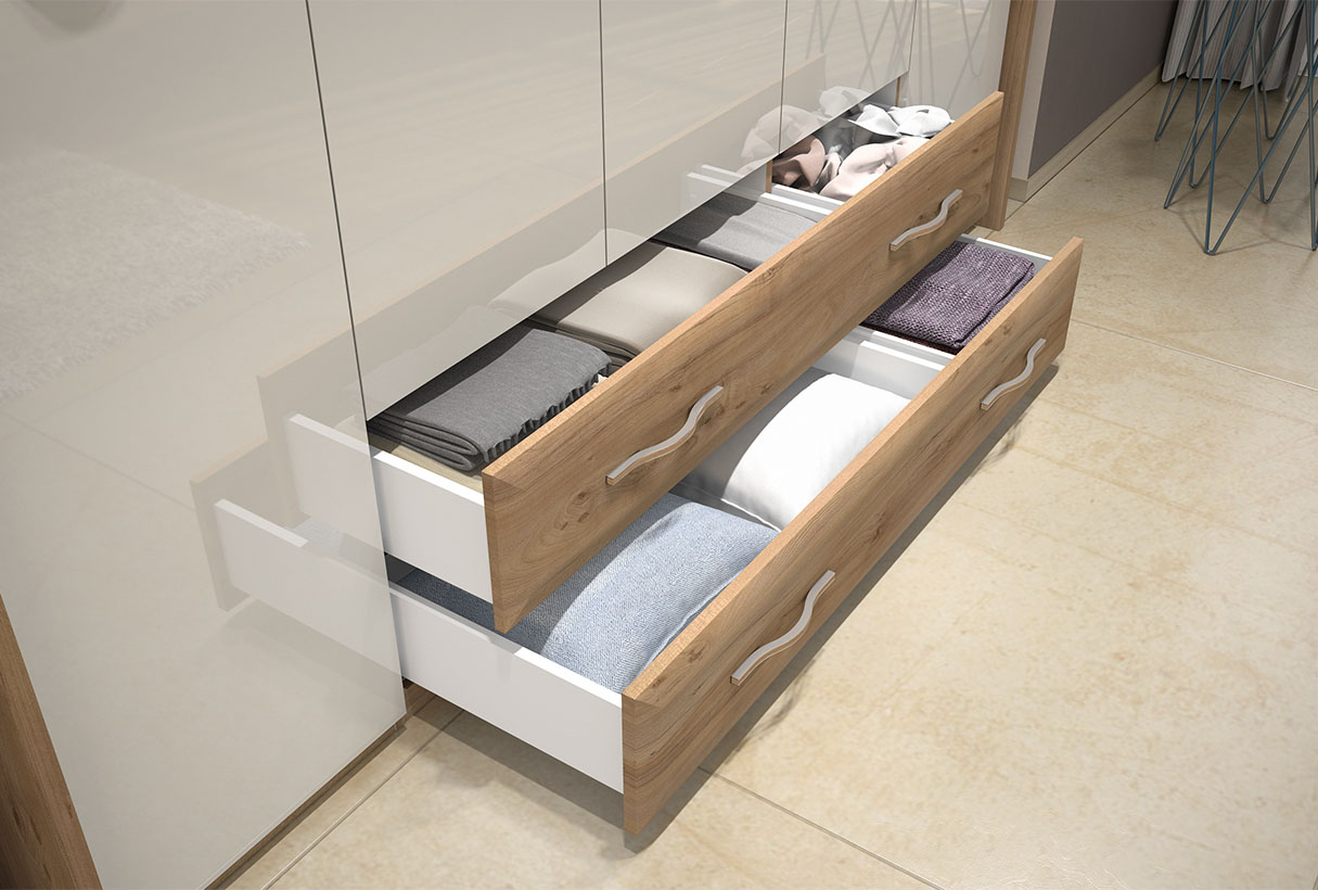 Стилна и практична колекция мебели за спалня Gala. Лицата на модулите са покрити с UV лак супер гланц в топъл бежов цвят, в комбинация с корпус 25мм от дървесен декор тихоокеански орех и елегантни хромирани дръжки.