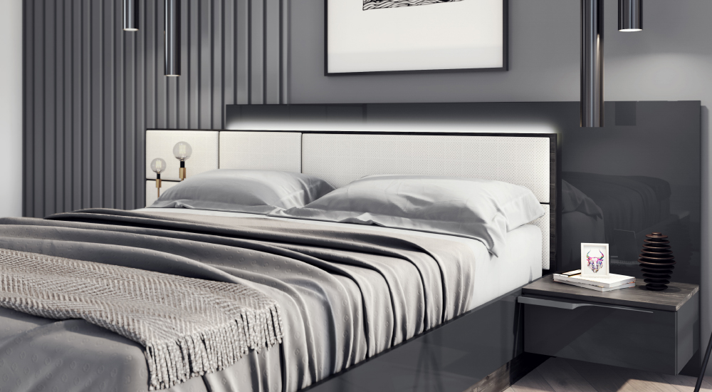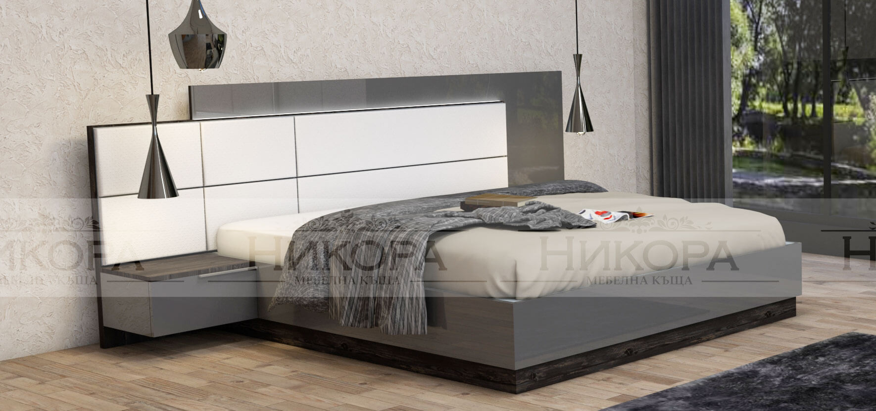 – Легло за матрак 160/200 с повд. механизъм, LED осветление на леглото – размери с 2 бр. нощно шкафче 2660/2130/960мм