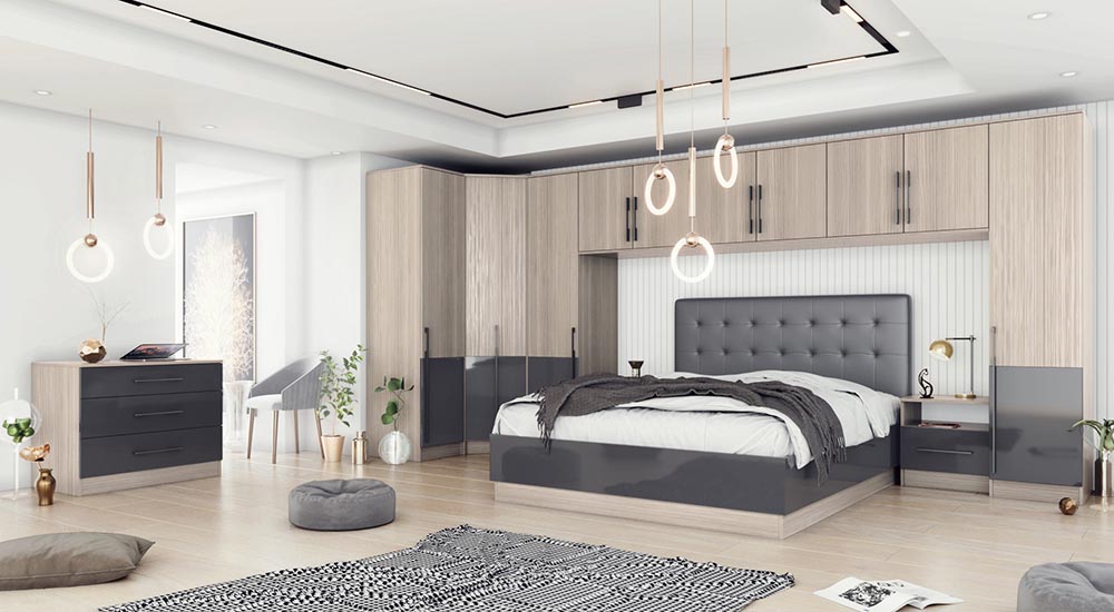 Модулна система за обзавеждане на спалня и юношеска стая Маями е изработена изцяло от МДФ кварц с меламиново покритие и МДФ антрацит гланц. Представлява осъвременен вариант на модулна система Калифорния в нова цветова комбинация и по-висок клас материал. Седемнадесетте модула дават гъвкаво решение за обзавеждането на спалня. Модерните цветове, съчетани с големите метални дръжки и огромното разнообразие от гардероби правят системата, желано бижу за всеки дом. Двата размера легла са подходящи за еднолицев или двулицев матрак. При варианта за двулицев матрак е необходимо да се закупи подматрачна рамка подходяща за монтиране на повдигащ механизъм. Модулите бюро и етажерка лесно се превръщат в тоалетка с подмяната етажерката с модул огледало. Пантите, водачите, плъзгащите врати с прецизно плавно затваряне и безшумна работа Ви осигуряват нужното спокойствие за пълноценна почивка и здравословен сън. Все пак всичко започва във Вашата спалня и … нека да започнем от спалнята!