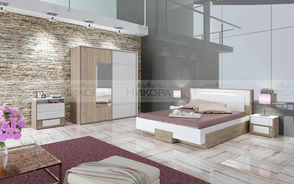 Спален комплект Нелия е в топла цветова комбинация. Леглото е с интересен дизайн и LED осветление на таблата. Разполага с повдигащи амортисьорни механизми за ползване на подматрачното пространство! Гардеробът притежава две плъзгащи врати с вътрешни механизми и огледало на една от вратите.